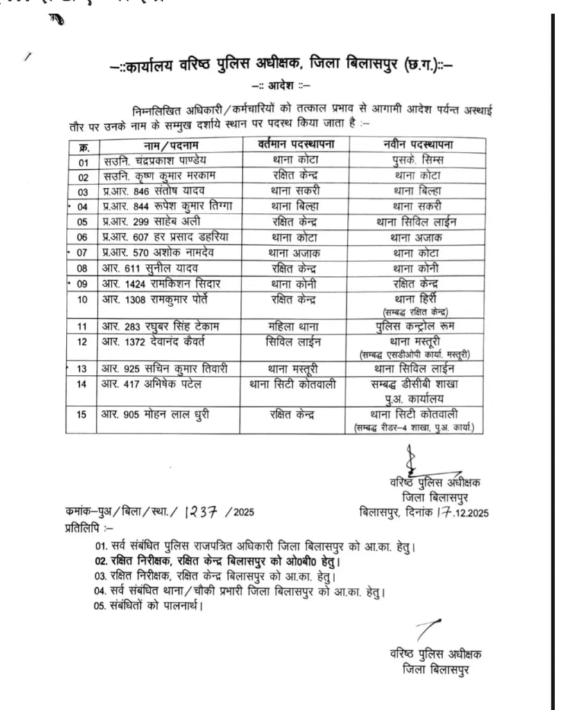 बिलासपुर। पुलिस विभाग में प्रशासनिक स्तर पर बड़ा फेरबदल किया गया है। पुलिस अधीक्षक रजनेश सिंह ने जिले में पदस्थ 15 पुलिसकर्मियों के तबादले के आदेश जारी किए हैं।