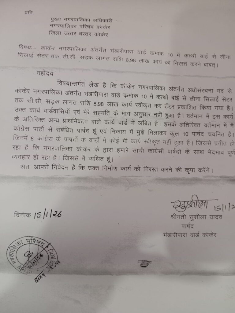भंडारी पारा वार्ड की पार्षद सुशीला यादव ने भी नगर पालिका अधिकारी को ज्ञापन सौंपते हुए कहा कि उनके वार्ड में कत्थो बाई के घर से लीना सिलाई सेंटर तक सीसी सड़क निर्माण कार्य 8.98 लाख रुपये की लागत से स्वीकृत किया गया है, जबकि इस कार्य की न तो उन्होंने और न ही वार्डवासियों ने मांग की थी। उन्होंने कहा कि वार्ड में अन्य प्राथमिक कार्य लंबित हैं, जिन्हें नजरअंदाज किया जा रहा है।