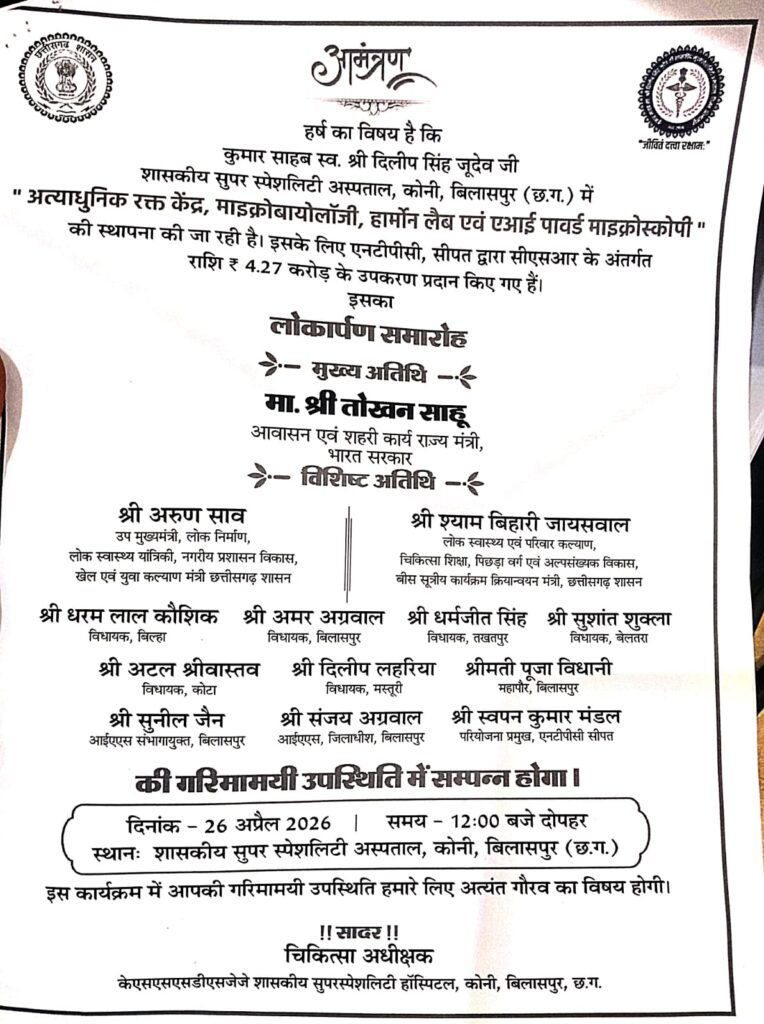 बिलासपुर, 23 अप्रैल 2026/केंद्रीय राज्य मंत्री तोखन साहू 26 अप्रैल को दोपहर 12 बजे कुमार साहब स्व.दिलीप सिंह जूदेव जी शासकीय सुपर स्पेशलिटी अस्पताल कोनी में अत्याधुनिक रक्त केंद्र, माइक्रोबायोलॉजी, हार्माेन लैब तथा एआई पावर्ड माइक्रोस्कोपी यूनिट का लोकार्पण करेंगे। एनटीपीसी सीपत द्वारा सीएसआर मद के अंतर्गत लगभग 4.27 करोड़ रुपये के उपकरण प्रदान किए गए हैं। इस आशय की जानकारी अस्पताल के संयुक्त संचालक सह चिकित्सा अधीक्षक के द्वारा दी गई।