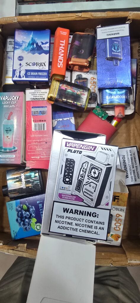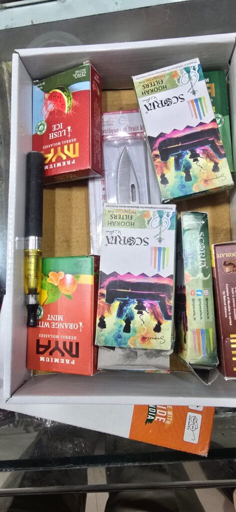 मामले का संक्षिप्त विवरण इस प्रकार है कि दिनांक 05/02/26 को थाना मणीपुर पुलिस को मुखबिर सूचना प्राप्त हुई कि जिला अस्पताल रोड मणीपुर स्कूल के सामने अमित मोबाइल व गिफ्ट गैलरी के संचालक द्वारा इलेक्ट्रॉनिक सिगरेट एवं उसके साथ में उपयोग में आने वाली वस्तुओं का दुकान में रख कर बिक्री किया जा रहा है। पुलिस टीम द्वारा त्वरित कार्यवाही कर मौके पर पहुंचकर देखा गया तो अमित मोबाइल व गिफ्ट गैलरी दुकान का संचालक उपस्थित मिला, जिससे पूछताछ करने पर अपना नाम अमित अग्रवाल आत्मज सुरेश अग्रवाल उम्र 35 वर्ष निवासी जिला अस्पताल रोड मणीपुर थाना मणीपुर का होना बताया। दुकान संचालक से इलेक्ट्रॉनिक सिगरेट एवं उसके साथ में उपयोग में आने वाली नशीली वस्तुओं के संबंध में पूछताछ किया गया तो संचालक द्वारा दुकान में इलेक्ट्रॉनिक सिगरेट एवं फ्लेवर रखकर बिक्री करना बताया गया। आरोपी की निशानदेही पर दुकान में रखा फ्लेवर लिक्विड 148 नग कीमती 14,100 रुपये, 16 नग वेप, ई-सिगरेट 02 नग, 12 नग brain freezer फ्लेवर कुल कीमती 49,400/- रुपये तथा चाइना चाकू 40 नग जप्त किया गया।