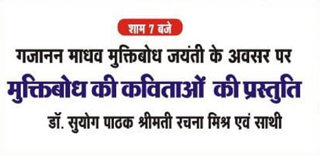 राष्ट्रीय मुक्तिबोध नाट्य समारोह के दूसरे दिन यानि 13 नवंबर को गजानन माधव मुक्तिबोध की कविताओं की भी प्रस्तुति होगी. क्योंकि इस दिन गजानन माधव मुक्तिबोध की जयंती भी है. इसीलिए प्रारंभ में मुक्तिबोध की कुछ कविताएं और अन्य कविताओं अन्य कवियों की कविताओं का पाठ भी किया जाएगा.