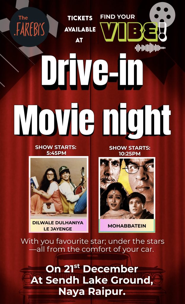 रायपुर। छत्तीसगढ़ की राजधानी रायपुर में पहली बार ड्राइव-इन मूवी का आयोजन किया जा रहा है, जिससे शहर में मेट्रो कल्चर का नया आयाम जुड़ गया है। एमएसएमई द फरेबिस ने सेंध लेक ग्राउंड में यह शो आयोजित करने की योजना बनाई है। पहला शो रविवार, 21 दिसंबर को आयोजित होगा, जिसमें शाम 5.45 बजे दिलवाले दुल्हनिया ले जाएंगे (DDLJ) दिखाई जाएगी। वहीं, उसी दिन रात 10.25 बजे फिल्म मोहब्बतें (Mohabbatein) का टेलीकास्ट होगा।