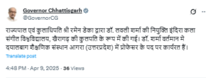 राज्यपाल रमेन डेका ने सोशल मीडिया में पोस्ट कर यह जानकारी दी.