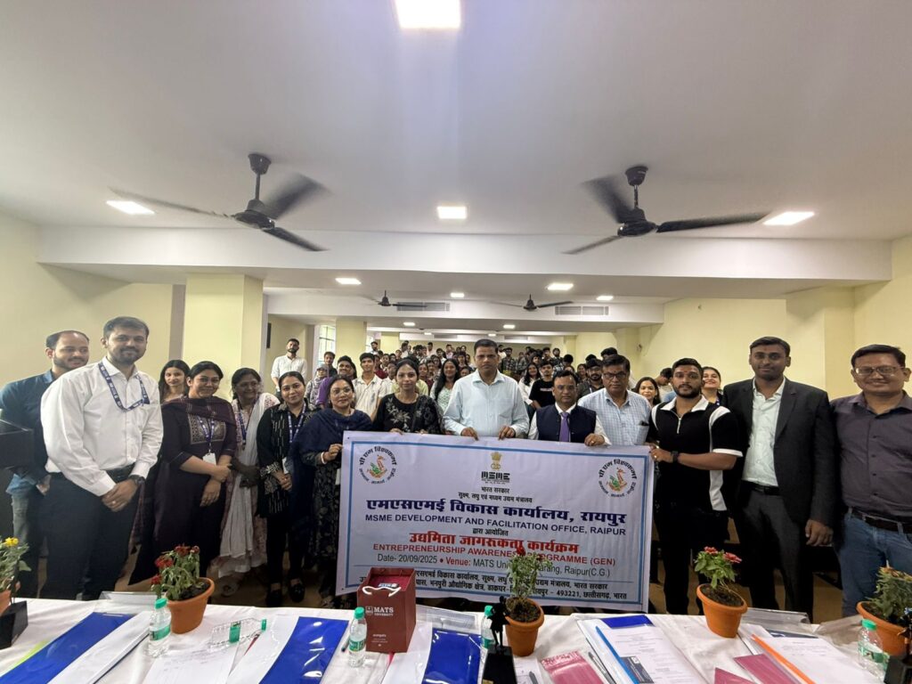रायपुर: मैट्स विश्वविद्यालय ने MSME विकास एवं सुविधा कार्यालय (DFO), रायपुर के सहयोग से एक एक दिवसीय उद्यमिता जागरूकता कार्यक्रम का सफल आयोजन किया। इस कार्यक्रम का उद्देश्य विद्यार्थियों एवं युवाओं में उद्यमशीलता की भावना को प्रोत्साहित करना था।