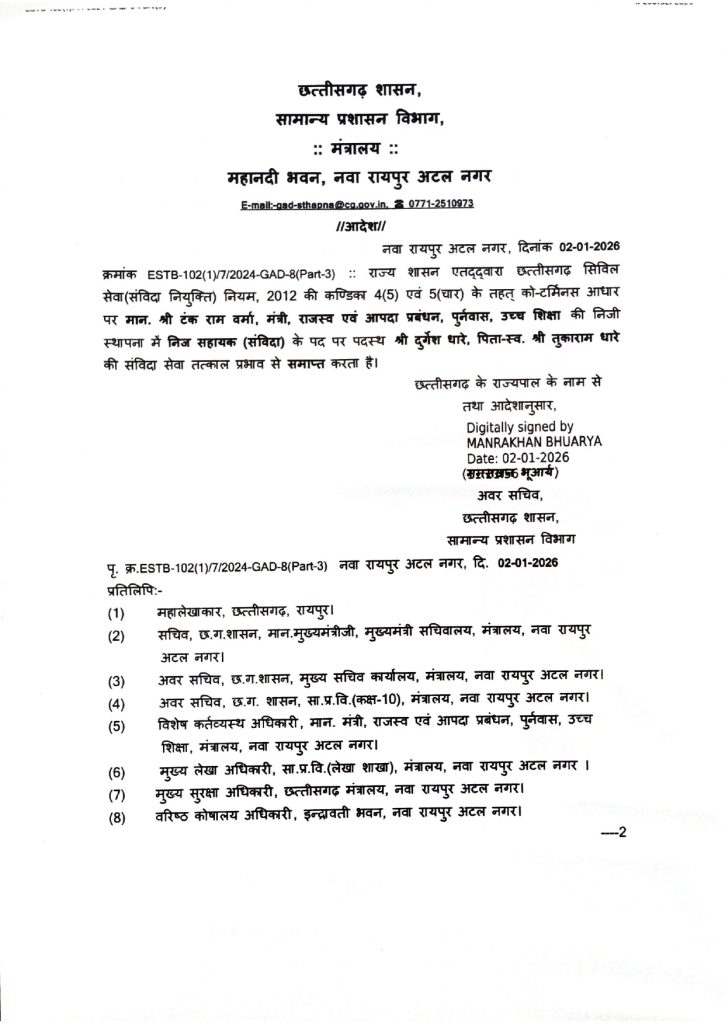 रायपुर। छत्तीसगढ़ शासन ने राजस्व मंत्री टंकराम वर्मा की निजी स्थापना में प्रशासनिक फेरबदल किया है। सामान्य प्रशासन विभाग ने आदेश जारी कर दुर्गेश धारे को निजी सहायक के पद से हटा दिया है। उनकी संविदा सेवा तत्काल प्रभाव से समाप्त कर दी गई है।