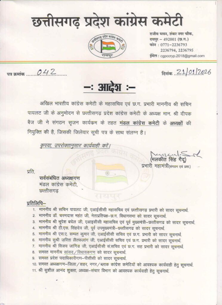 रायपुर। छत्तीसगढ़ कांग्रेस ने संगठनात्मक ढांचे में बड़ा बदलाव करते हुए पहली बार प्रदेश के सभी जिलों में मंडल कांग्रेस कमेटियों के अध्यक्षों की नियुक्ति की है। प्रदेश कांग्रेस अध्यक्ष दीपक बैज ने AICC महासचिव एवं छत्तीसगढ़ प्रभारी सचिन पायलट की मंजूरी के बाद इस संबंध में सूची जारी की। पार्टी ने जिलेवार कुल 1,370 मंडल अध्यक्षों की नियुक्ति की है।