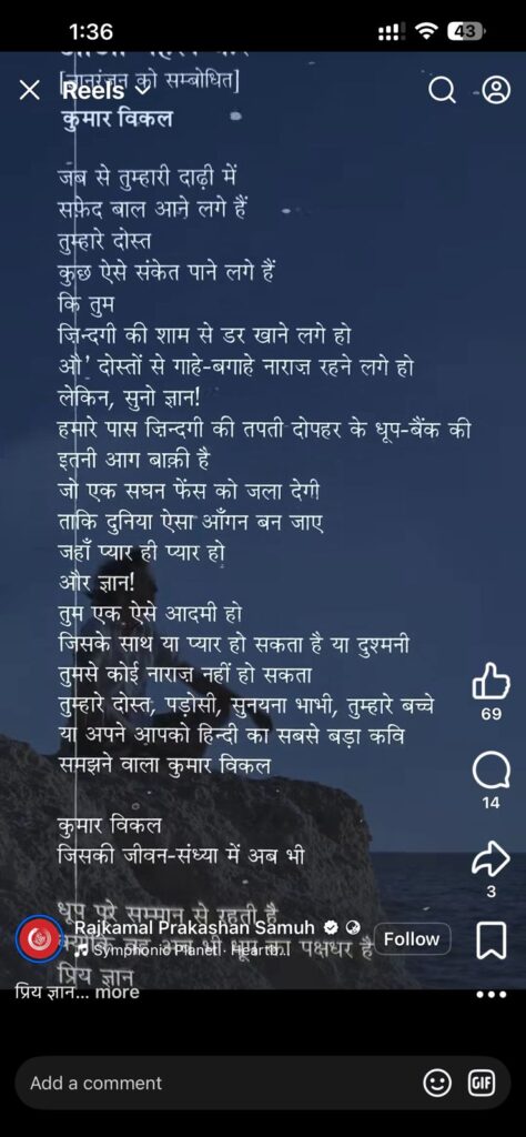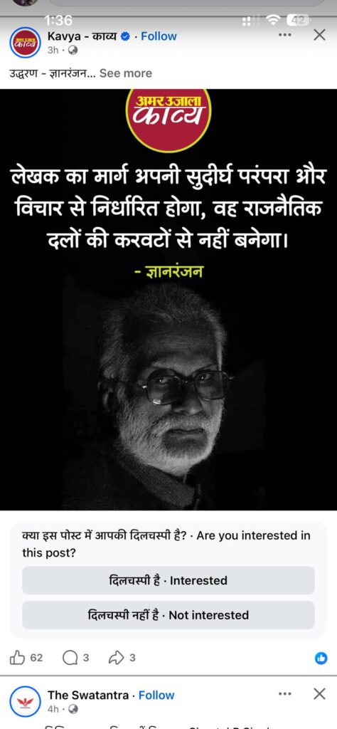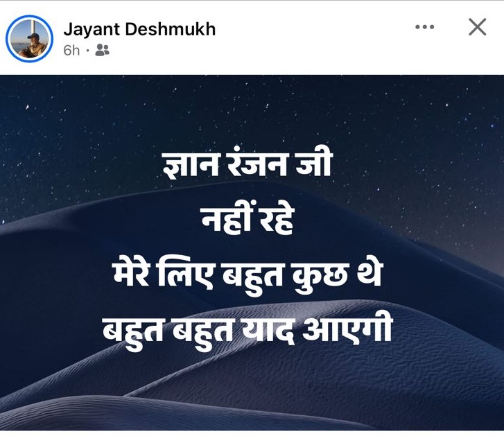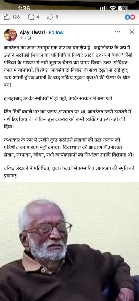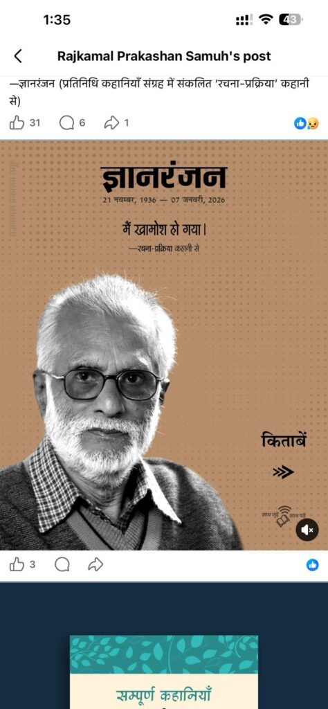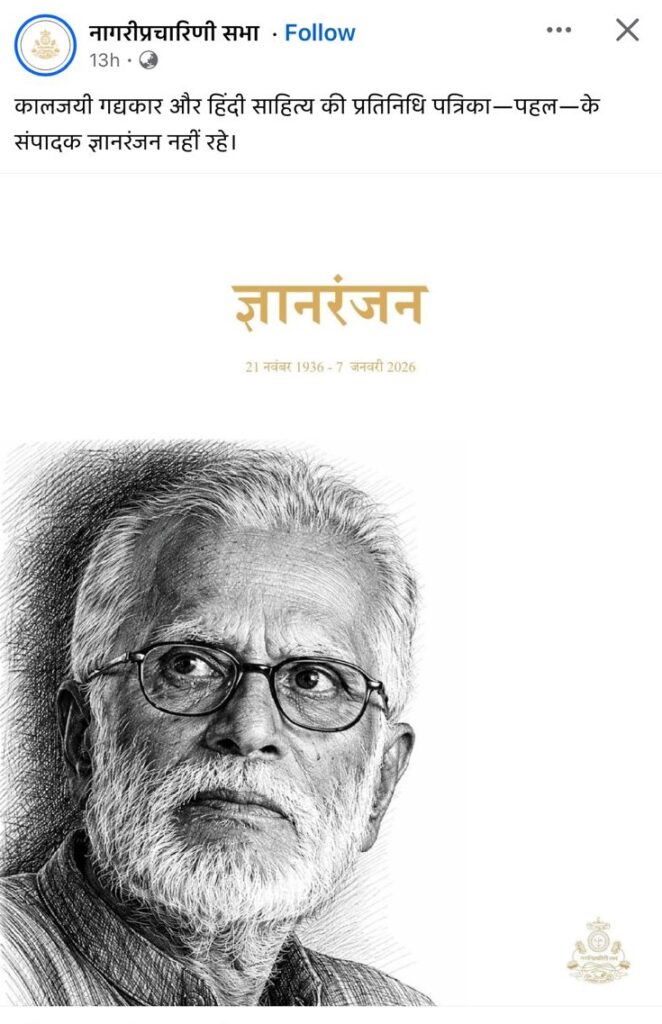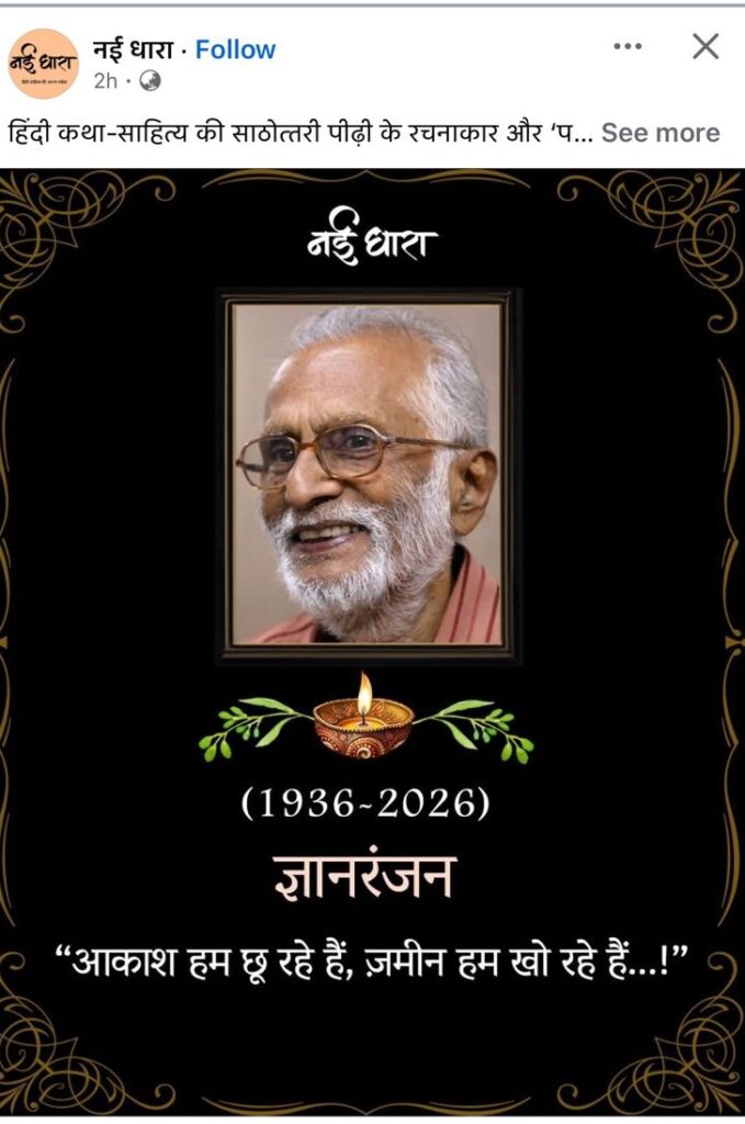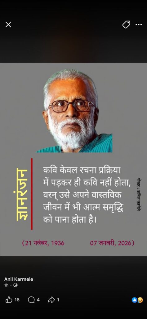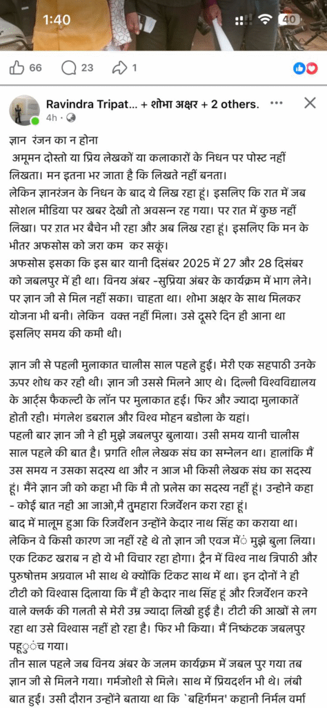 अमूमन दोस्तो या प्रिय लेखकों या कलाकारों के निधन पर पोस्ट नहीं लिखता। मन इतना भर जाता है कि लिखते नहीं बनता। लेकिन ज्ञानरंजन के निधन के बाद ये लिख रहा हूं। इसलिए कि रात में जब सोशल मीडिया पर खबर देखी तो अवसन्न रह गया। पर रात में कुछ नहीं लिखा। पर ऱात भर बैचेन भी रहा और अब लिख रहा हूं। इसलिए कि मन के भीतर अफसोस को जरा कम कर सकूं। अफसोस इसका कि इस बार यानी दिसंबर 2025 में 27 और 28 दिसंबर को जबलपुर में ही था। विनय अंबर -सुप्रिया अंबर के कार्यक्रम में भाग लेने। पर ज्ञान जी से मिल नहीं सका। चाहता था। शोभा अक्षर के साथ मिलकर योजना भी बनी। लेकिन वक्त नहीं मिला। उसे दूसरे दिन ही आना था इसलिए समय की कमी थी।