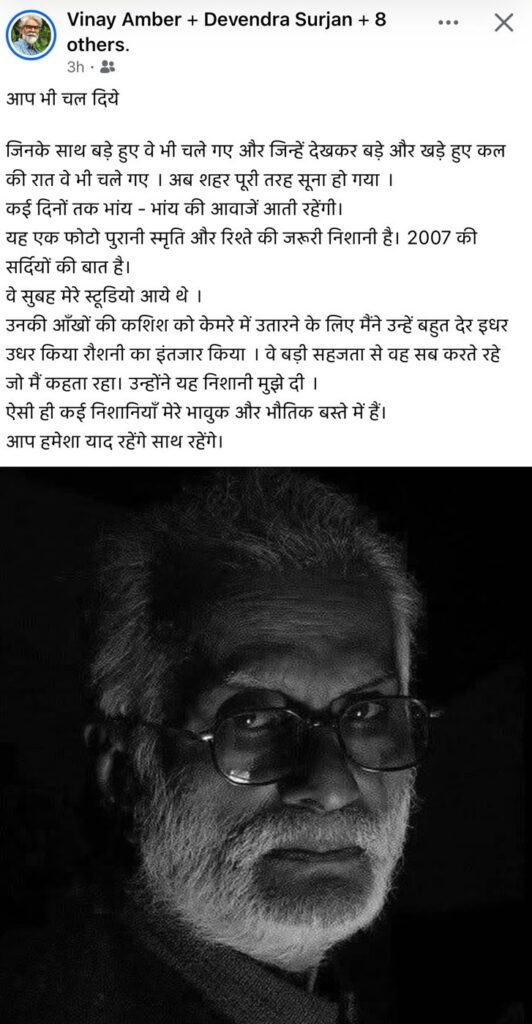 जिनके साथ बड़े हुए वे भी चले गए और जिन्हें देखकर बड़े और खड़े हुए कल की रात वे भी चले गए । अब शहर पूरी तरह सूना हो गया । कई दिनों तक भांय – भांय की आवाजें आती रहेंगी। यह एक फोटो पुरानी स्मृति और रिश्ते की जरूरी निशानी है। 2007 की सर्दियों की बात है। वे सुबह मेरे स्टूडियो आये थे । उनकी आँखों की कशिश को केमरे में उतारने के लिए मैंने उन्हें बहुत देर इधर उधर किया रौशनी का इंतजार किया । वे बड़ी सहजता से वह सब करते रहे जो मैं कहता रहा। उन्होंने यह निशानी मुझे दी । ऐसी ही कई निशानियाँ मेरे भावुक और भौतिक बस्ते में हैं। आप हमेशा याद रहेंगे साथ रहेंगे।