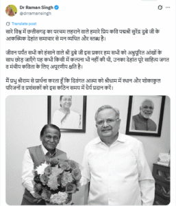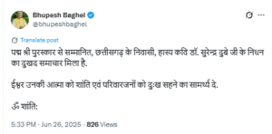 पूर्व मुख्यमंत्री भूपेश बघेल ने शोक व्यक्त करते हुए लिखा-: पद्म श्री पुरस्कार से सम्मानित, छत्तीसगढ़ के निवासी, हास्य कवि डॉ. सुरेन्द्र दुबे जी के निधन का दुखद समाचार मिला है. ईश्वर उनकी आत्मा को शांति एवं परिवारजनों को दुःख सहने का सामर्थ्य दे. ॐ शांति: