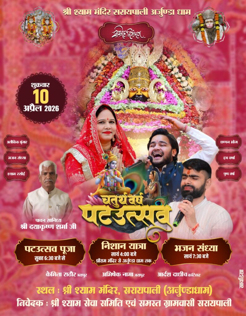 सरायपाली= अर्जुन्डा धाम स्थित श्री श्याम मंदिर में इस वर्ष 10 अप्रैल को पट उत्सव के चौथे वर्ष मे निशान यात्रा , भजन गायन व पट उत्सव पूजा का कार्यक्रम आयोजित किया जा रहा है ।