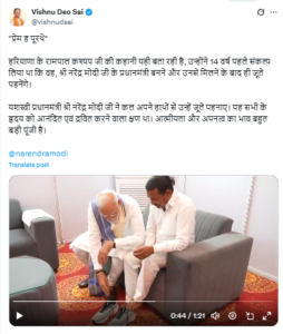 मुख्यमंत्री विष्णु देव साय ने प्रधानमंत्री नरेंद्र मोदी का एक वीडियो साझा किया जिसमें प्रधानमंत्री मोदी एक व्यक्ति को जूता पहना रहे हैं. सीएम साय ने वीडियो का कैप्शन दिया ‘प्रेम ह पूरथे’ इसके बाद उन्होने पूरी जानकारी भी साझा की.