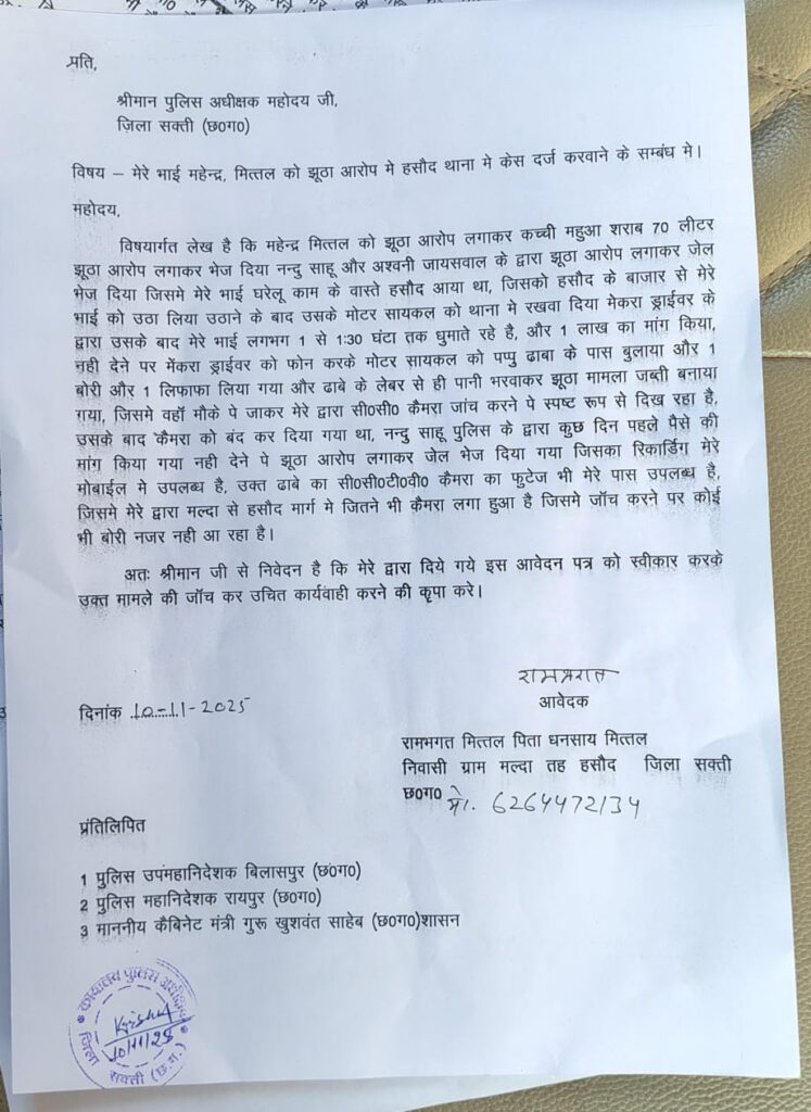 जानकारी के मुताबिक, ग्राम मल्दा निवासी रामभगत मित्तल ने पुलिस अधीक्षक को आवेदन देकर शिकायत की है कि उसके भाई महेंद्र मित्तल को हसौद थाना के प्रधान आरक्षक नंदू साहू और प्रधान आरक्षक अश्वनी जायसवाल ने झूठे शराब केस में फंसा कर जेल भेज दिया है। पीड़ित परिवार का कहना है कि 9 नवंबर को महेंद्र मित्तल अपने निजी कार्य से हसौद आया था, तभी दोनों पुलिस कर्मियों ने उसे रोक लिया, गाड़ी में बिठाया और करीब डेढ़ घंटे तक घुमाते रहे। इस दौरान उन्होंने एक लाख रुपए की मांग की।