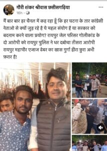 राजधानी सहित पूरे प्रदेश में एक के बाद एक अपराध थमने का नाम नहीं ले रहा है आए दिन राजधानी में चाकू बाजी हत्या लूट के साथ साथ प्रदेश भर में अपराध लगातार घटित हो रहे हैं वहीं राजनीतिक गलियारों की बात करें तो अब अपराधियों के कुंडली निकालने में राजनीतिक पार्टी लगे हुए हैं आरोपियों/ अपराधियों की कुंडली मिलने का काम कर रहे हैं कल जेल परिसर के बाहर हुई गोलीकांड में आरोपी को गिरफ्तार करने के बाद पुलिस ने जब फोटो जारी किया तब आरोपी की फोटो राजधानी रायपुर के महापौर एजाज ढेबर के साथ महापौर का गुर्गा बताया जा रहा…वहीं भाजपा के कुछ नेता पूर्व मुख्यमंत्री भूपेश बघेल और प्रदेश अध्यक्ष दीपक बैज से जवाब तक मांग डालें.