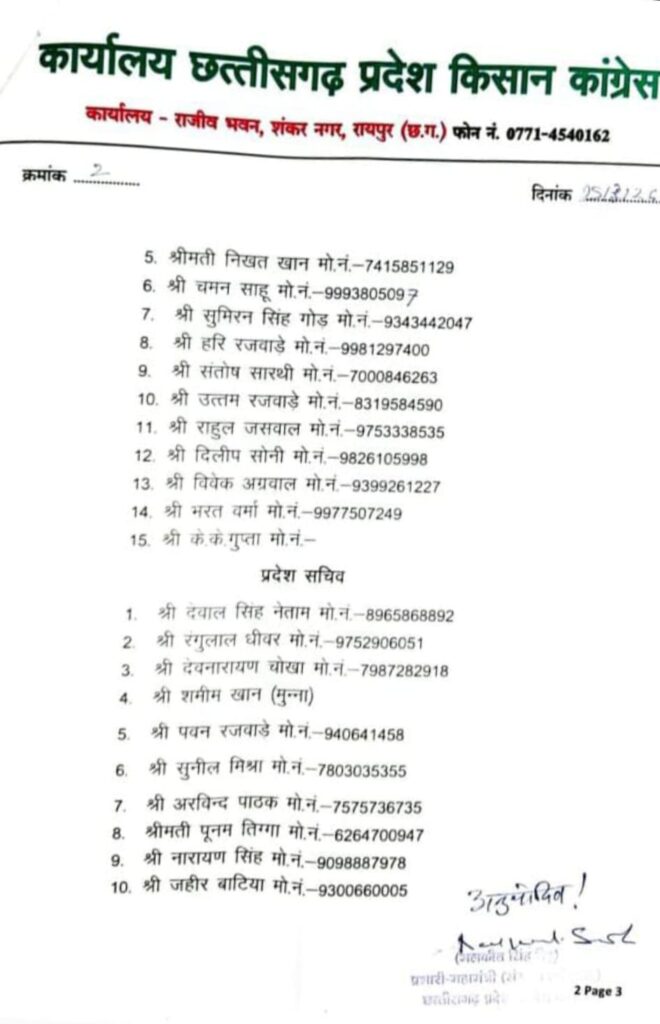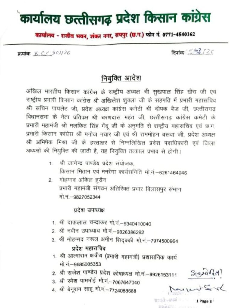 कोरिया/अखिल भारतीय किसान कांग्रेस के राष्ट्रीय अध्यक्ष सुखपाल सिंह खैरा एवं राष्ट्रीय प्रभारी किसान कांग्रेस अखिलेश शुक्ला की सहमति में प्रभारी महासचिव सचिन पायलट कांग्रेस प्रदेश अध्यक्ष दीपक बैज नेता प्रतिपक्ष छत्तीसगढ़ डॉक्टर चरण दास महंत छत्तीसगढ़ कांग्रेस कमेटी की अनुमति से राष्ट्रीय महासचिव एवं छत्तीसगढ़ प्रभारी किसान कांग्रेस मनोज नचार एवं राममोहन बरुवा प्रदेश अध्यक्ष अभिषेक मिश्रा द्वारा प्रदेश पदाधिकारी एवं जिला अध्यक्षों की नियुक्ति की गईl
