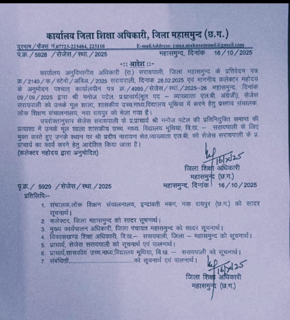 इस संबंध में जिला शिक्षा अधिकारी विनय कुमार लहरे द्वारा जारी आदेश में बताया गया है कि अनुविभागीय अधिकारी (रा.) सरायपाली जिला महासमुन्द के प्रतिवेदन पत्र क्र/2140/क/स्टेनो/अविअ./2025 सरायपाली, दिनांक 28.02.2025 एवं कलेक्टर के अनुमोदन पश्चात् कार्यालयीन पत्र क्र./4995/सेजेस/स्था/2025-26 महासमुन्द दिनांक 09/09/2025 द्वारा मनोज पटेल, प्र.प्राचार्य (मूल पद व्याख्याता एल.बी. अंग्रेजी), सेजेस सरायपाली को उनके मूल शाला, शासकीय उच्च माध्य. विद्यालय भूथिया में करने हेतु प्रस्ताव संचालक, लोक शिक्षण संचालनालय, नवा रायपुर को भेजा गया है।