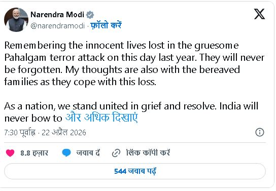 पीएम मोदी ने अपने संदेश में कहा कि पिछले साल पहलगाम में हुए हमले में जान गंवाने वाले लोगों को देश कभी नहीं भुला पाएगा। उन्होंने आतंकवाद के खिलाफ भारत की ‘जीरो टॉलरेंस’ नीति को दोहराते हुए कहा कि दुश्मन चाहे कितनी भी कोशिश कर ले, उनके नापाक इरादे कभी कामयाब नहीं होंगे। प्रधानमंत्री ने इसे राष्ट्र के संकल्प की घड़ी बताते हुए आतंकवाद के हर स्वरूप को कुचलने की प्रतिबद्धता जताई।