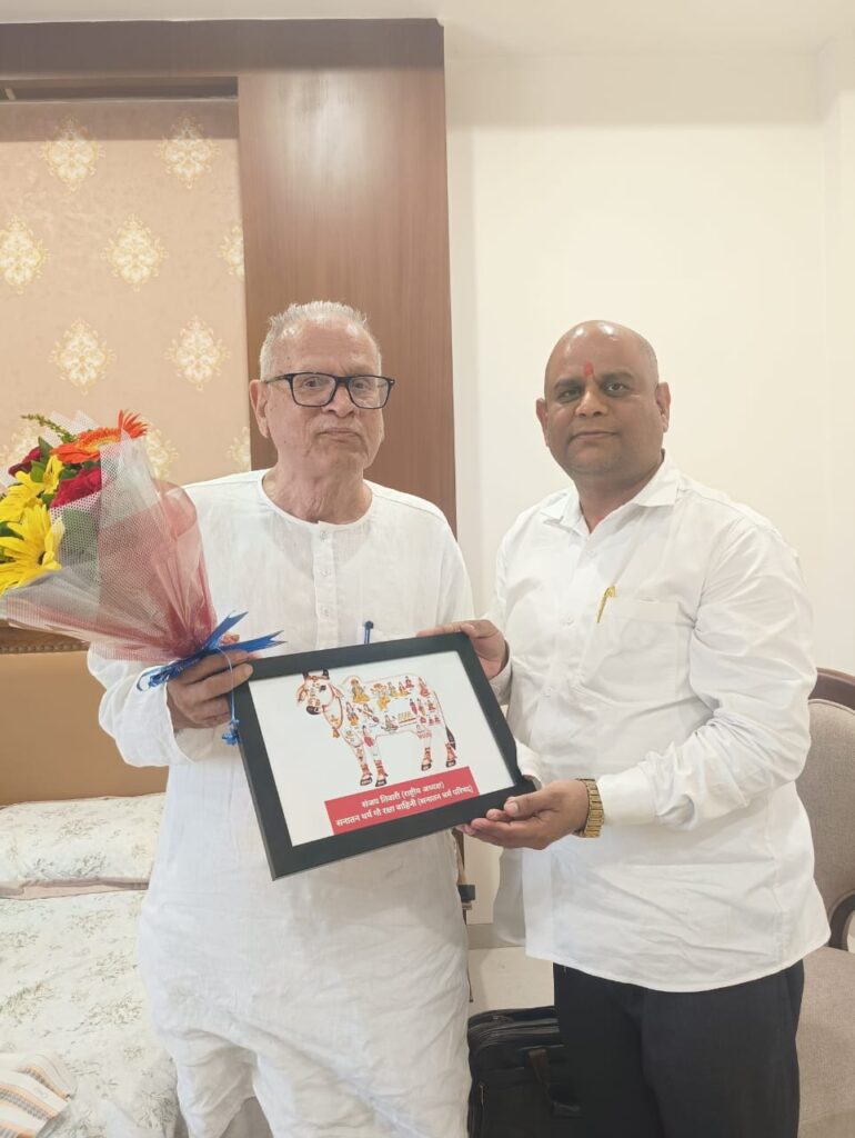 भिलाई :- एस आर हॉस्पिटल एंड कॉलेज चिखली दुर्ग (छत्तीसगढ़) के चेयरमैन एवं जाने-माने समाज सेवी संजय तिवारी को सनातन धर्म परिषद् न्यास की शाखा सनातन धर्म गौ रक्षा वाहिनी का राष्ट्रीय अध्यक्ष नियुक्त किया गया है। इस महत्तवपूर्ण जिम्मेदारी को बेहतर ढंग से निभाने के लिए संजय तिवारी ने हाल ही में राष्ट्रीय स्वयंसेवक संघ (RSS) के वरिष्ठ राष्ट्रीय पदाधिकारी बिसरा राम यादव से उनके निवास पर मुलाकात की और उनका मार्गदर्शन व आशीर्वाद लिया।