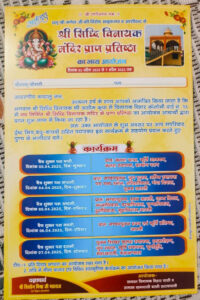 इस संबंध में विनायक विहार समिति ने जानकारी देते हुवे बताया कि यह समारोह आगामी 03 अप्रैल से 7 अप्रैल 2025 तक आयोजित किया जायेगा । इस दौरान 3 अप्रैल को प्रातः कलश यात्रा, मूर्ति आनयन, कलश स्थापना, ब्राम्हण वरण , 4 अप्रैल को मण्डपपूजन, जप पूजन, अग्नि स्थापना पंच गव्य स्नान, हरिद्रादिवास, गंधा दिवास, पूजन आरती ,5 अप्रैल को प्रातः मण्डपपूजन, हवन आरती, धान्य दिवस, अन्नाधिवास, वस्त्राधिवास, पूण्याधिवास, दुर्वाधिवास, मुदाधिवास, आरती , 6 अप्रैल को प्रातः मण्डपपूजन हवन एवं मूर्ति प्रतिष्ठा, आरती तथा 7 अप्रैल को पूजन शिखर कुलश स्थापना, वजारोहण, जुप स्थान, मूर्ति स्थापना, पूर्णाहनि, महाआरती, महाभण्डारा का आयोजन किया जायेगा । उक्त सभी प्राण प्रतिष्ठा का आयोजन यज्ञाचार्य श्रीमत चित्रसेन मिश्रा जी महाराज के सानिध्य में सम्पन्न होगा । समिति द्वारा पूरे 5 दिनों तक भंडार का भी आयोजन रखा गया है ।