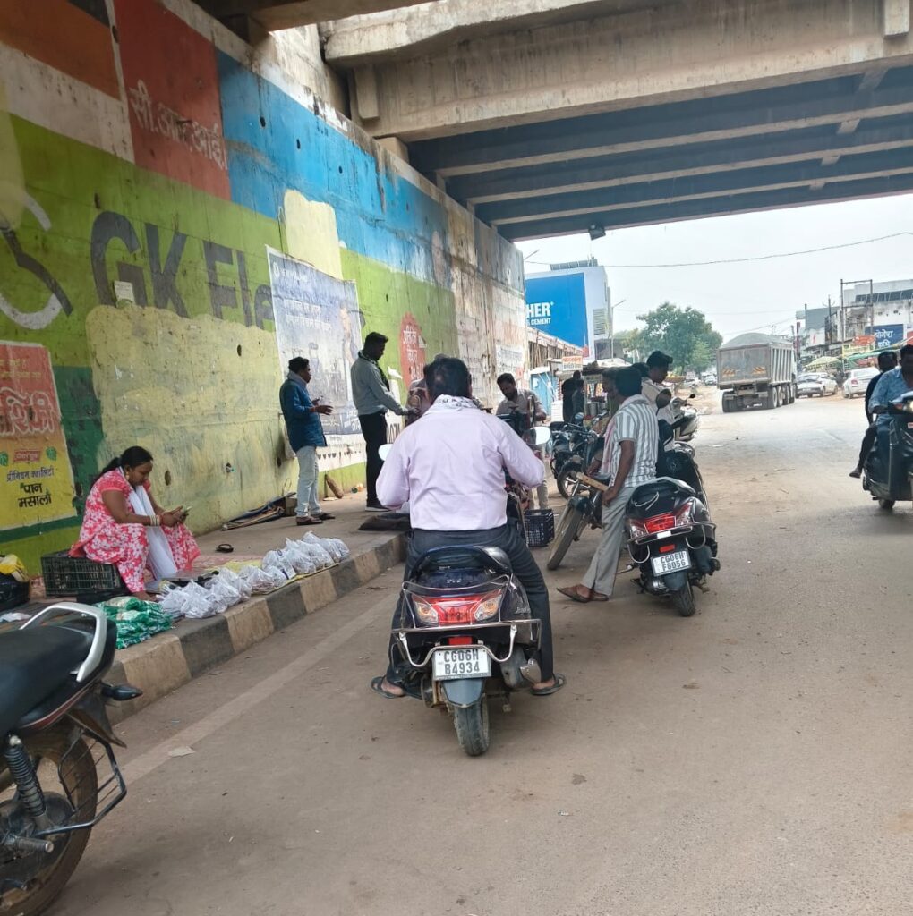 नगर के बाहर फोरलेन सड़क का निर्माण किया गया है । क्रासिंग के कारण यह ओव्हर ब्रिज का निर्माण किया गया है । ब्रिज के नीचे व आसपास फल , गुपचुप , सब्जी , मछली के साथ ही अनेक दुकानदारों द्वारा सुविधा को देखते हुवे दुकानों लगा दी गई है । तड़के सुबह से काफी संख्या में लगने वाली दुकानें देर रात तक लगे रहती है । निर्माण एजेंसी द्वारा पुल के नीचे तकनीकी रूप से पुल की मजबूती के लिए चौड़ा व लंबा बेस परछी नुमा बनाया गया है ।यही चबूतरा इन दुकानदारों के लिए दुकान लगाने का सुरक्षित स्थान मिल गया जहां अनेकों की रोजी रोटी तो चल रही है