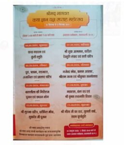 इस संबंध में आयोजको ने जानकारी देते हुए बताया कि 6 सितंबर को कथा महात्म्य एवं कुंती स्तुति , 7 को श्री शुक आगमन, कपिल देवहूति व सती चरित्र , 8 को ध्रुव , ऋषभ , जड़भरत , अजानील व प्रह्लाद चरित्र , 9 को गजेंद्र मोक्ष , वगमन अवतार , श्रीराम जन्म व श्रीकृष्ण जन्मोत्सव , 10 को बाललीला की गिरिराज पूजन व छप्पनभोग , 11 को महारास , कंसवध व श्रीकृष्ण रुक्मणि विवाह , 12 को सुदामा चरित्र , परीक्षित मोक्ष व शुकदेवजी पूजन तथा 13 सितंबर अंतिम दिवस श्री गीताजी का पाठ , तुलसी वर्षा व हवन पूर्णाहुति का आयोजन किया जायेगा ।