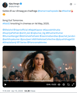बॉलीवुड की सबसे चर्चित अपराध-थ्रिलर फ्रैंचाइज़ी रेड”  की सीक्वल रेड 2″ (RAID 2) के पहले गाने नशा” का टीजर रिलीज़ होते ही सोशल मीडिया पर धूम मच गया है.  अजय देवगन और रितेश देशमुख की इस फिल्म का यह स्पेशल सॉन्ग तमन्ना भाटिया पर फिल्माया गया है, जिसने फैंस को उनके पिछले सेंसेशनल गाने आज की रात” (स्त्री 2) की याद दिला दी.
