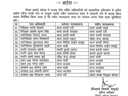 सिविल लाइन थाना से उप निरीक्षक सुमन पोया को लेमरू थाना प्रभारी बनाया गया है, जबकि उप निरीक्षक पुरुषोत्तम उईके को पाली से सिविल लाइन थाना भेजा गया है।