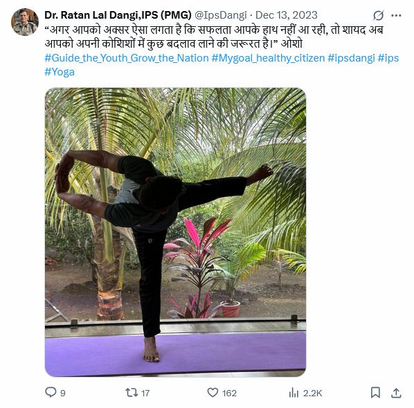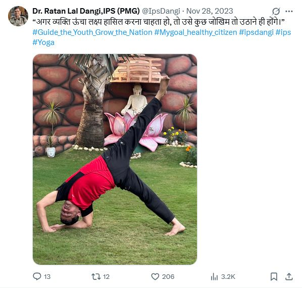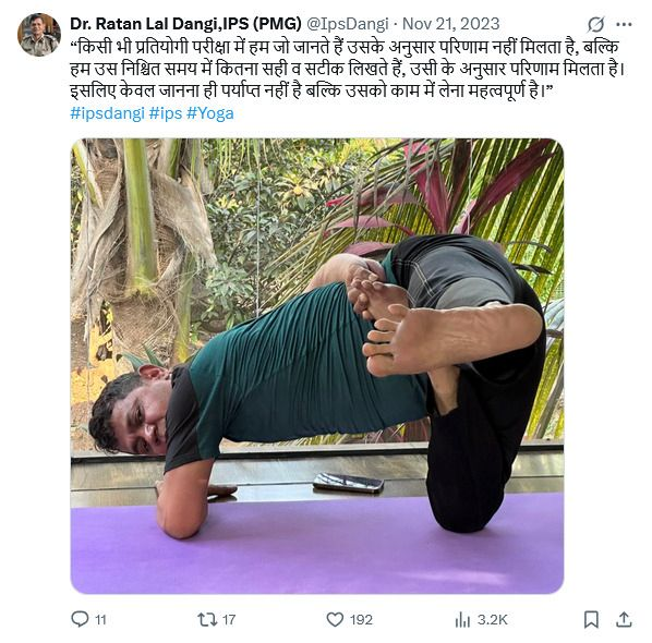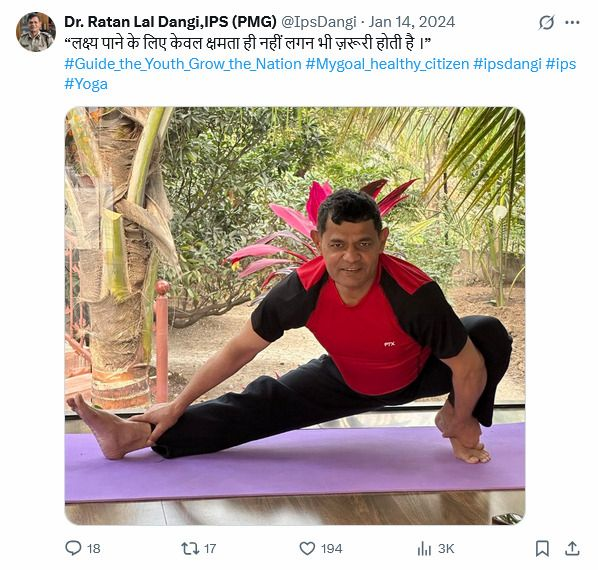 आईपीएस रतनलाल डांगी अपनी फिटनेस पर भी काफी ध्यान रखते हैं। अक्सर वे अपनी तस्वीरें सोशल मीडिया पर योग करते हुए पोस्ट करते हैं। ऐसी ही कुछ तस्वीरें उन्होंने सोशल मीडिया पर पोस्ट की है..