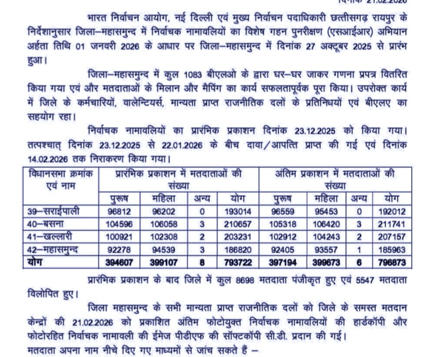 सरायपाली : SIR के महासमुंद जिले में 8698 न्यू मतदाताओ को जोड़ा गया तो वहीं 5547 नाम विलोपित किये गये । भारत निर्वाचन आयोग, नई दिल्ली एवं मुख्य निर्वाचन पदाधिकारी छत्तीसगढ़, रायपुर के निर्देशानुसार जिला महासमुंद में निर्वाचक नामावलियों का विशेष गहन पुनरीक्षण (एसआईआर) अभियान अर्हता तिथि 01 जनवरी 2026 के आधार पर 27 अक्टूबर 2025 से प्रारंभ किया गया। उपजिला निर्वाचन अधिकारी सचिन भूतड़ा ने आज राजनीतिक दलों की बैठक में बताया कि कलेक्टर एवं जिला निर्वाचन अधिकारी विनय लंगेह के मार्गदर्शन में जिले के कुल 1083 बीएलओ द्वारा घर-घर जाकर गणना प्रपत्रों का वितरण किया गया। इस दौरान मतदाताओं के मिलान एवं मैपिंग का कार्य सफलतापूर्वक पूर्ण हुआ। अभियान में जिले के कर्मचारियों, वॉलेंटियर्स, मान्यता प्राप्त राजनीतिक दलों के प्रतिनिधियों एवं बीएलए का सहयोग रहा। निर्वाचक नामावलियों का प्रारंभिक प्रकाशन 23.12.2025 को किया गया। इसके पश्चात 23.12.2025 से 22.01.2026 के मध्य दावा/आपत्तियाँ प्राप्त की गईं, जिनका 14.02.2026 तक निराकरण किया गया। प्रारंभिक प्रकाशन के बाद जिले में 8,698 नए मतदाता पंजीकृत हुए तथा 5,547 मतदाताओं के नाम विलोपित किए गए। जिले के सभी मान्यता प्राप्त राजनीतिक दलों को 21.02.2026 को प्रकाशित अंतिम फोटोयुक्त निर्वाचक नामावलियों की हार्डकॉपी की हार्डकॉपी एवं फोटो रहित निर्वाचक नामावली की ईमेज पीडीएफ (सीडी) बैठक के दौरान प्रदान की गई।