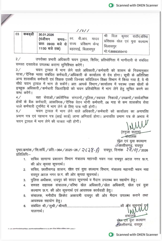 वहीं कबड्डी खेल के लिए चयन ट्रायल 30 जनवरी 2026 को स्वर्गीय बी.आर. यादव राज्य प्रशिक्षण केंद्र, बहतराई, बिलासपुर में आयोजित होंगे।