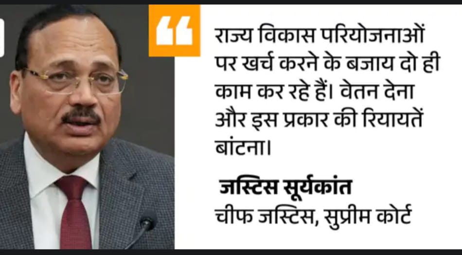 सीजेआई सूर्यकांत ने देश मे फ्रीबीज सिस्टम पर टिप्पणी करते हुए कहा कि इस तरह से फ्रीबीज बांटने पर देश का आर्थिक विकास रुकेगा. कुछ लोग एजुकेशन या बेसिक लाइफ़ अफ़ोर्ड नहीं कर सकते. उन लोगों को सुविधा देना राज्य का फ़र्ज़ है, लेकिन फ्रीबीज पहले उनकी जेब में जा रहे हैं जो लोग मजे कर रहे हैं. क्या यह ऐसी चीज नहीं है, जिस पर सरकारों ध्यान देना चाहिए?