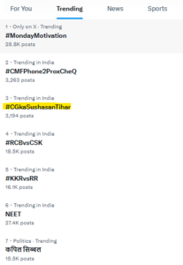 वहीं सोशल मीडिया में साय सरकार के सुशासन के तिहार की भी चर्चा है. माइक्रो ब्लागिंग साइट एक्स में भारत भर में दूसरे स्थान पर ट्रेंड कर रहा है