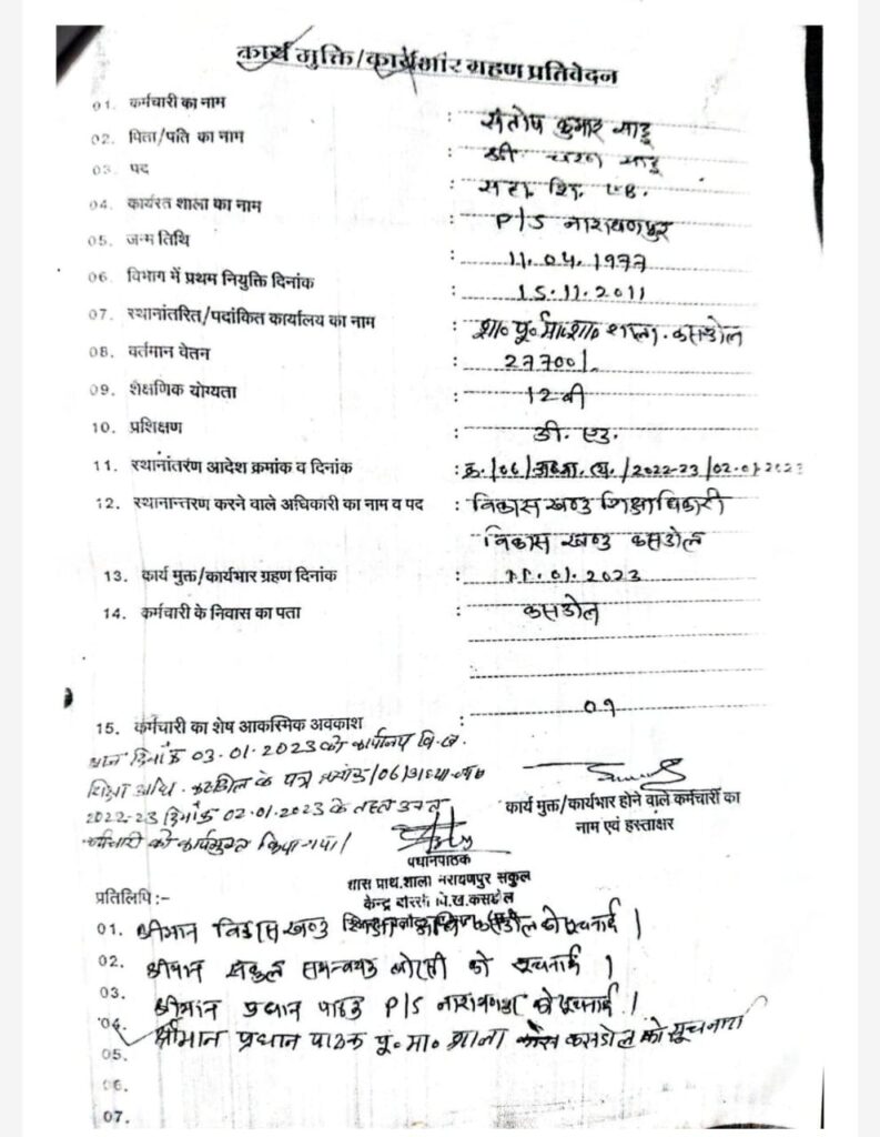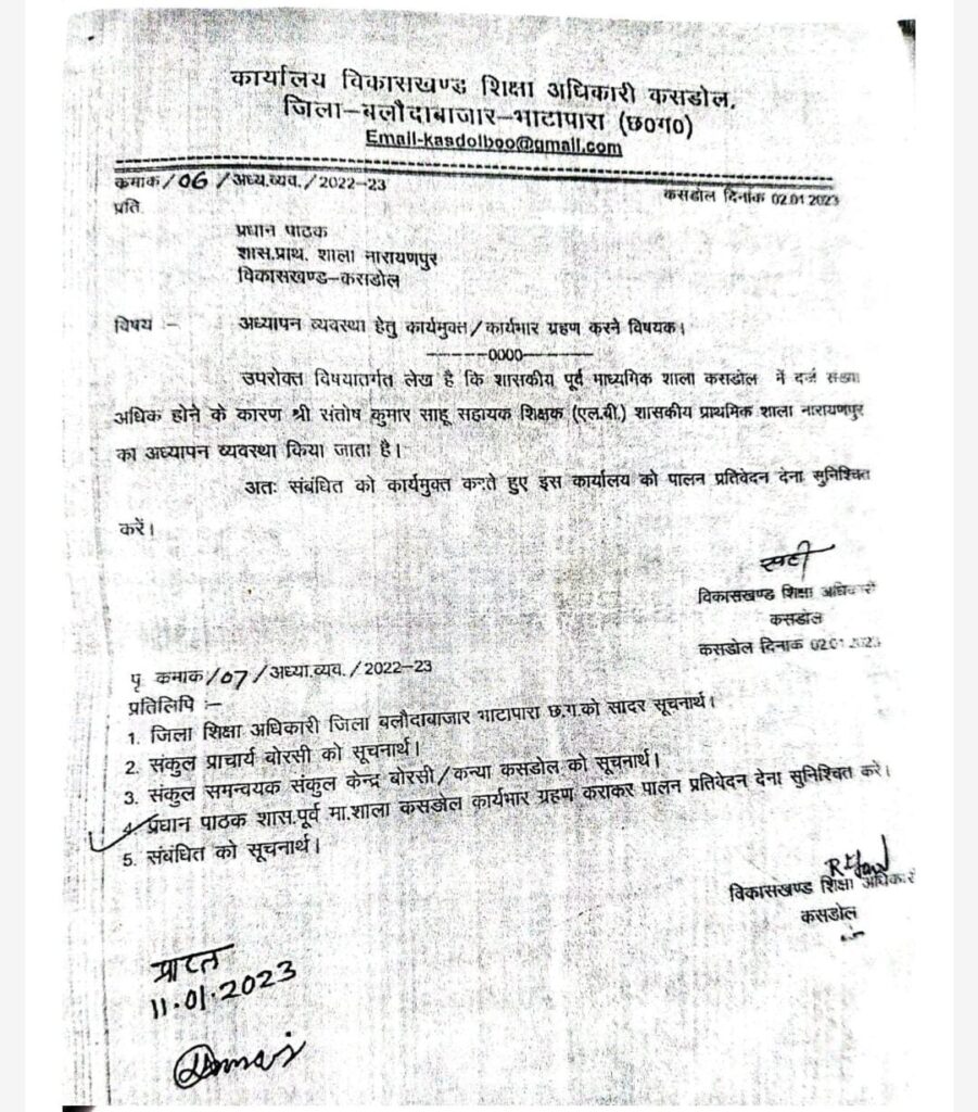 दरअसल प्रधानपाठक ने सौंपे शिकायत पत्र में बताया कि सहायक शिक्षक संतोष कुमार साहू का मूल शाला नारायणपुर था लेकिन तात्कालिक बीईओ राधेलाल जायसवाल द्वारा शासकीय प्राथमिक शाला आदर्श कसडोल में अध्यापन व्यवस्था हेतु बीते दिनांक 02.01.2023 को आदेश क्रमांक 06 के तहत आदेशित किया गया था जिसके परिपालन में दिनांक- 02.01.2023 को शासकीय प्राथमिक शाला आदर्श कसडोल के लिए संतोष कुमार साहू सहायक शिक्षक को कार्यमुक्त कर दिया गया था लेकिन उक्त शिक्षक ने वहाँ जॉइनिंग नही किया बल्कि फर्जी आदेश बनाकर अन्य स्कूल में जॉइनिंग लेकर पढ़ाते रहें।