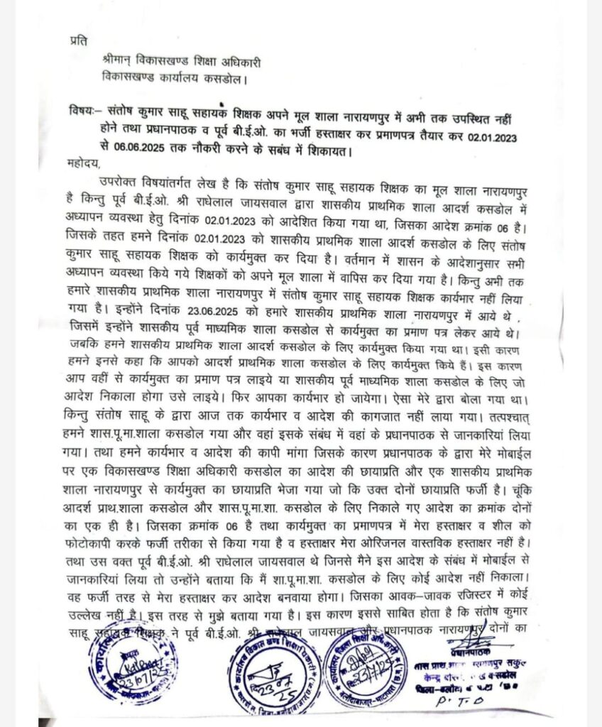 विकासखंड के शासकीय प्राथमिक शाला नारायणपुर के प्रधान पाठक सम्मेलाल साहू ने विकासखंड शिक्षा अधिकारी सहित जिले के तमाम अधिकारियों के समक्ष सहायक शिक्षक संतोष कुमार साहू की शिकायत किया है, शिकायत में उक्त प्रधान पाठक ने आरोप लगाया है कि श्री साहू प्रधानपाठक व तात्कालिक बीईओ का फ़र्जी हस्ताक्षर से प्रमाणपत्र तैयार कर बीते दिनांक 02.01.2023 से 06.06.2025 तक फर्जी आदेश के तहत नौकरी किया।