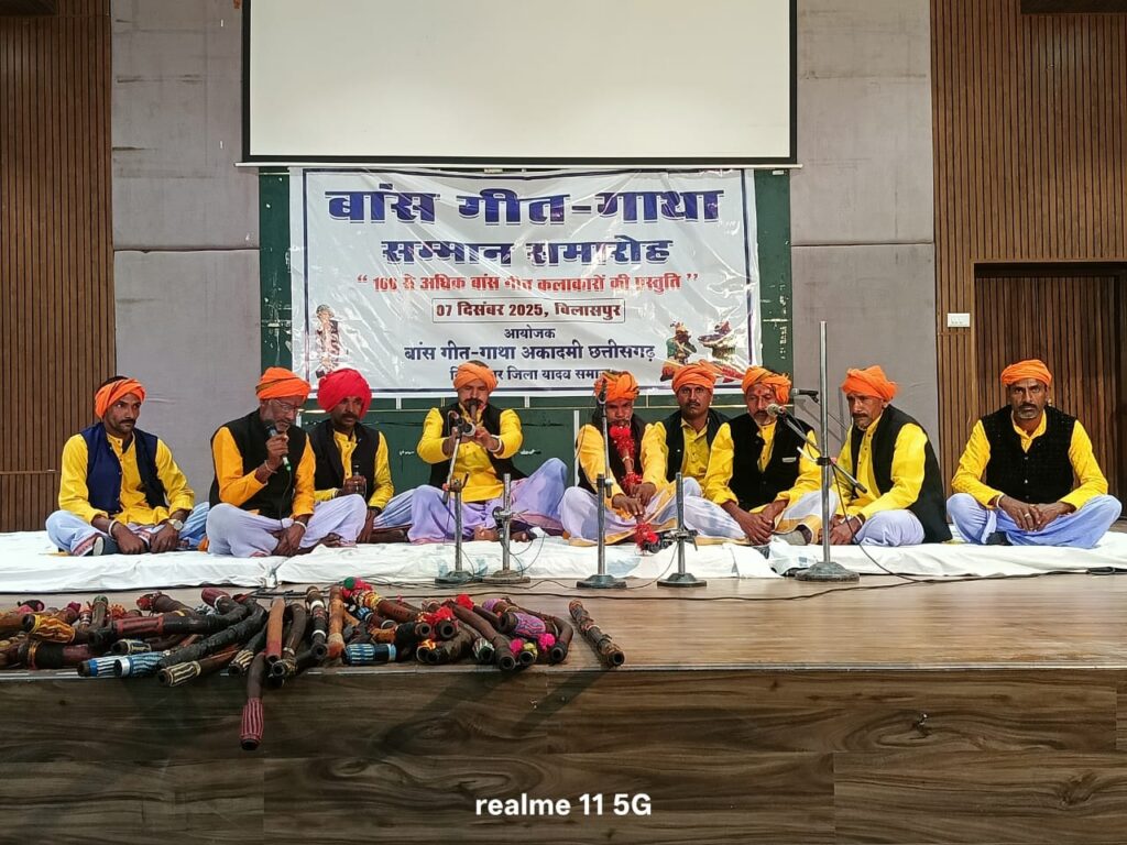 बिलासपुर। बांस गीत गाथा अकादमी छत्तीसगढ़ द्वारा आयोजित बांस गीत गाथा समारोह में एक सौ पचास से अधिक बांस गायक और वादक कलाकारो ने एक साथ बांस गीत, वादन और गाथा का प्रदर्शन कर छत्तीसगढ़ के इतिहास में पहली बार प्रस्तुति देकर रिकॉर्ड बनाया। पंडित देवकी नंदन दीक्षित सभा भवन, लाल बहादुर शास्त्री स्कूल परिसर में आयोजित था जो रात तक चला।