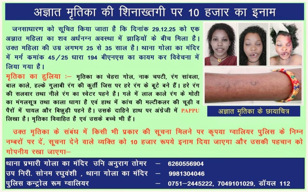 ग्वालियर। मध्य प्रदेश के ग्वालियर में हाल ही में नग्न अवस्था में बरामद महिला के शव की पहचान आर्टिफिशियल इंटेलिजेंस (AI) तकनीक की मदद से की गई है। पुलिस ने AI के जरिए महिला की तस्वीर तैयार कर आसपास के इलाकों में दिखाई और पहचान बताने वाले के लिए 10 हजार रुपये इनाम की घोषणा की थी। इसी दौरान एक व्यक्ति ने महिला की पहचान कर पुलिस को अहम जानकारी दी, जिसके बाद मामले में हत्या का केस दर्ज कर जांच तेज कर दी गई है।