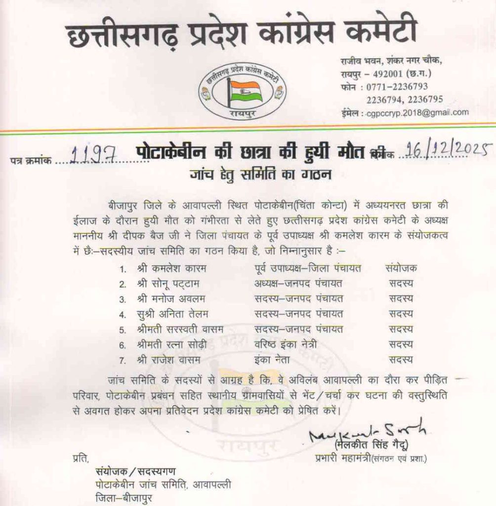 वहीं, छत्तीसगढ़ कांग्रेस कमेटी ने भी इस मामले को लेकर सात सदस्यीय जांच समिति बनाई है। इसके संयोजक हैं जिला पंचायत के पूर्व उपाध्यक्ष कमलेश कारम, और अन्य सदस्य में जनपद पंचायत सदस्य मनोज अवलम, सरस्वती वासम, वरिष्ठ इंका नेता रत्ना सोढ़ी और इंका नेता राजेश वासम शामिल हैं। कांग्रेस का उद्देश्य यह सुनिश्चित करना है कि घटना की जांच पारदर्शी और निष्पक्ष तरीके से हो।