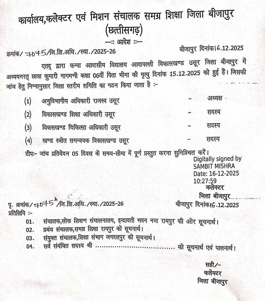 बीजापुर। छत्तीसगढ़ के आवापल्ली (चिन्तकोंटा) कन्या आवासीय विद्यालय में 6वीं कक्षा की छात्रा कुमारी नागमणी की 15 दिसंबर को इलाज के दौरान मौत का मामला अब गंभीर रूप ले चुका है। इस घटना के बाद न केवल स्थानीय लोगों में नाराजगी है, बल्कि प्रशासन और राजनीतिक दल भी सक्रिय हो गए हैं।