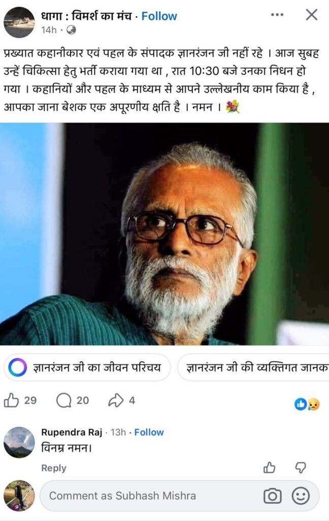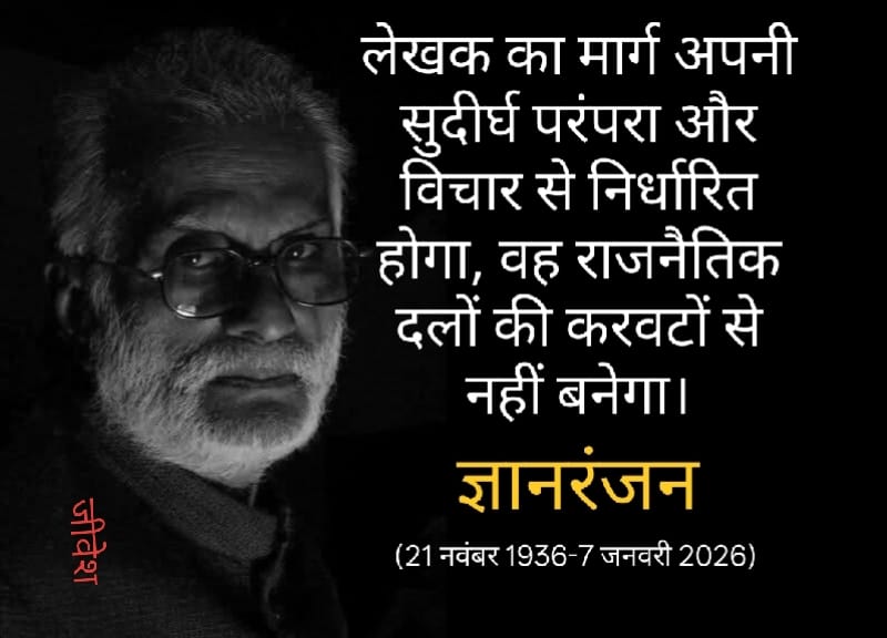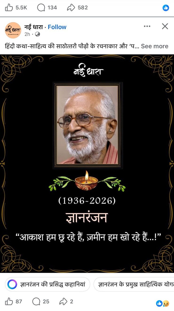 हिंदी के अप्रतिम कथाकार ज्ञान रंजन जी के निधन की ख़बर आ रही है। क्या कहूँ…एक युग बीत रहा है जिसकी भव्यता और दिव्यता को हमने देखा था। 101, रामनगर, आधारताल, जबलपुर.. यह कई दशकों तक सिर्फ़ एक पत्रिका नहीं अपितु हिन्दी साहित्य समाज की आश्वस्ति का पता था जो हमसे छिन गया।