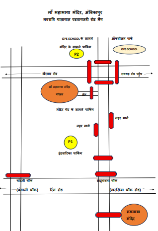 सदभावना चौक से सीधे महामाया मंदिर न जाकर चांदनी चौक–घुटरापारा सड़क के रास्ते मंदिर पहुंचेंगे। पार्किंग की सुविधा मंदिर के सामने मैदान में उपलब्ध रहेगी।