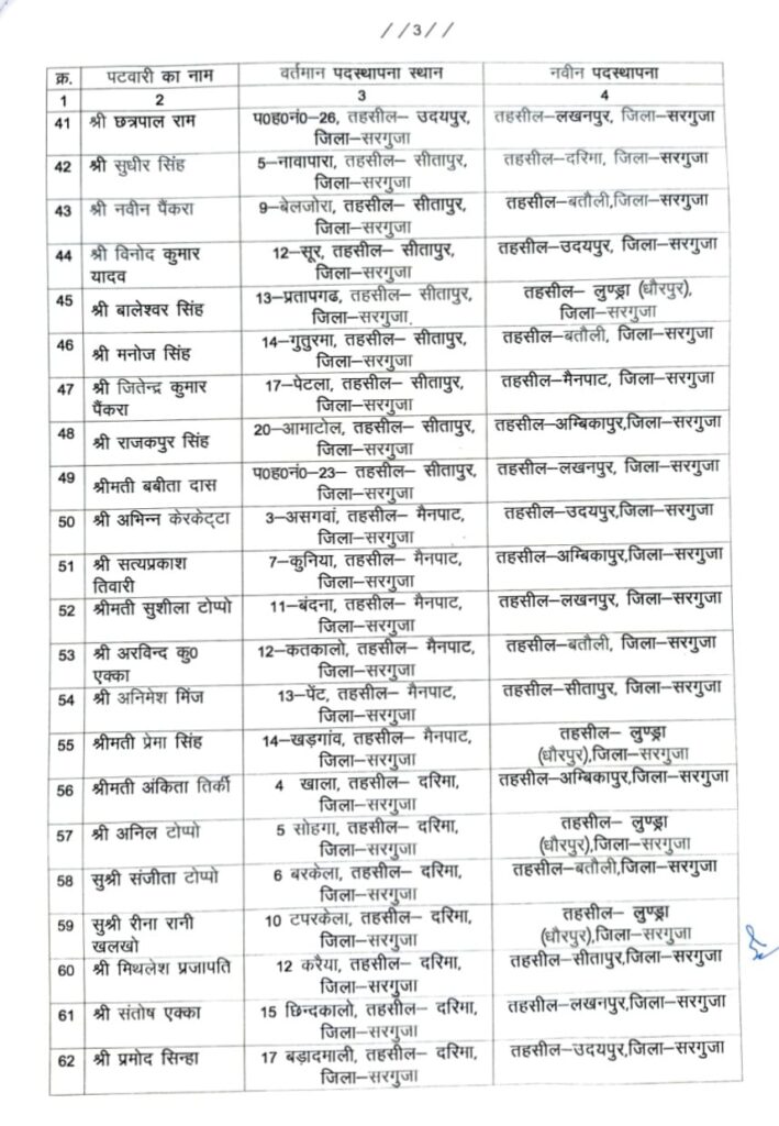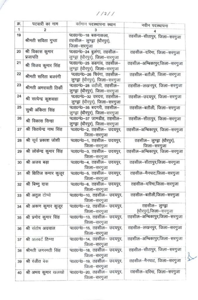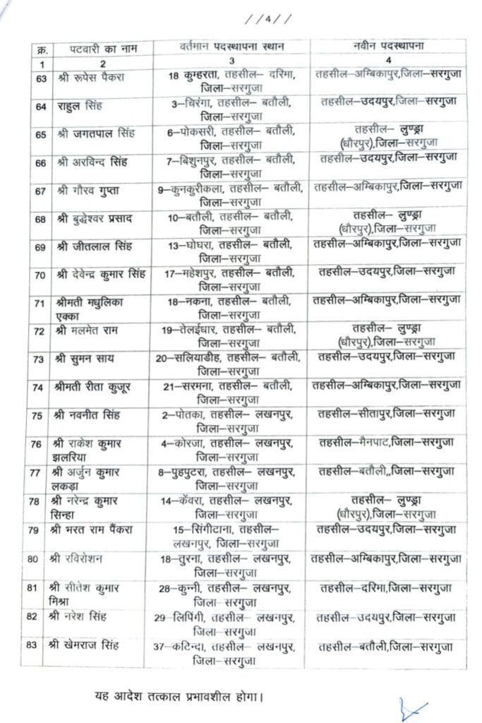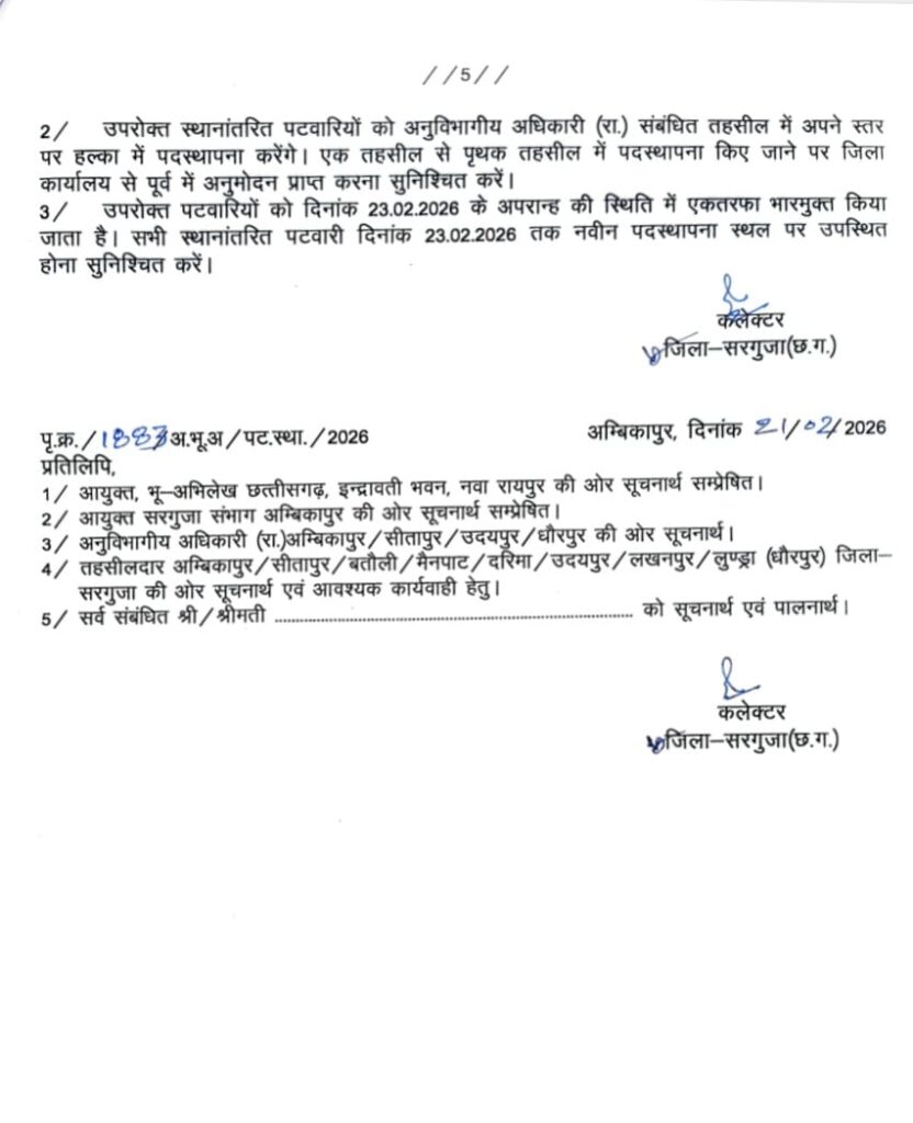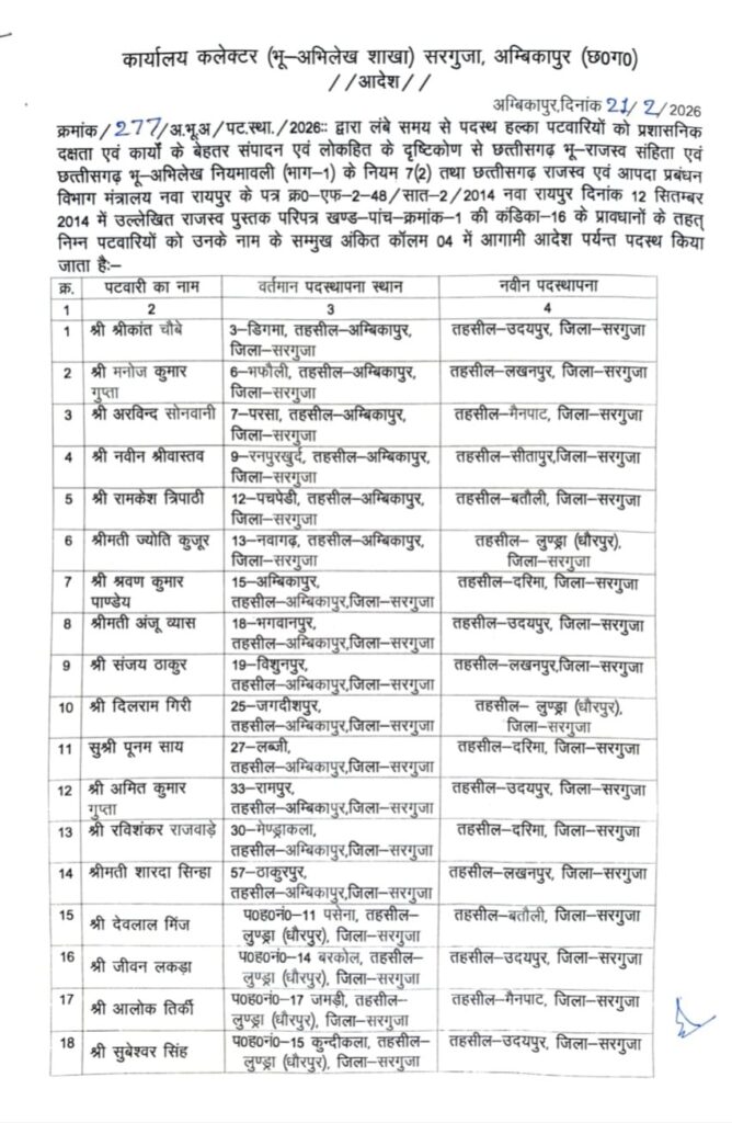 अंबिकापुर 21 फरवरी 2026/ कलेक्टर अजीत वसंत ने प्रशासनिक कार्यों में दक्षता, पारदर्शिता एवं लोकहित को दृष्टिगत रखते हुए लंबे समय से एक ही स्थान पर पदस्थ 83 हल्का पटवारियों का स्थानांतरण आदेश जारी किया है।