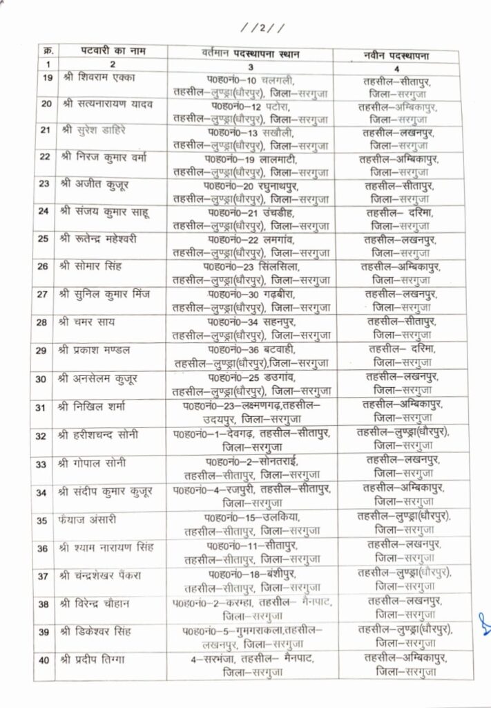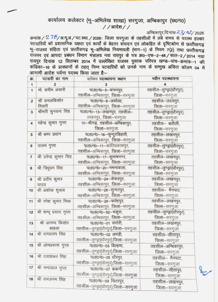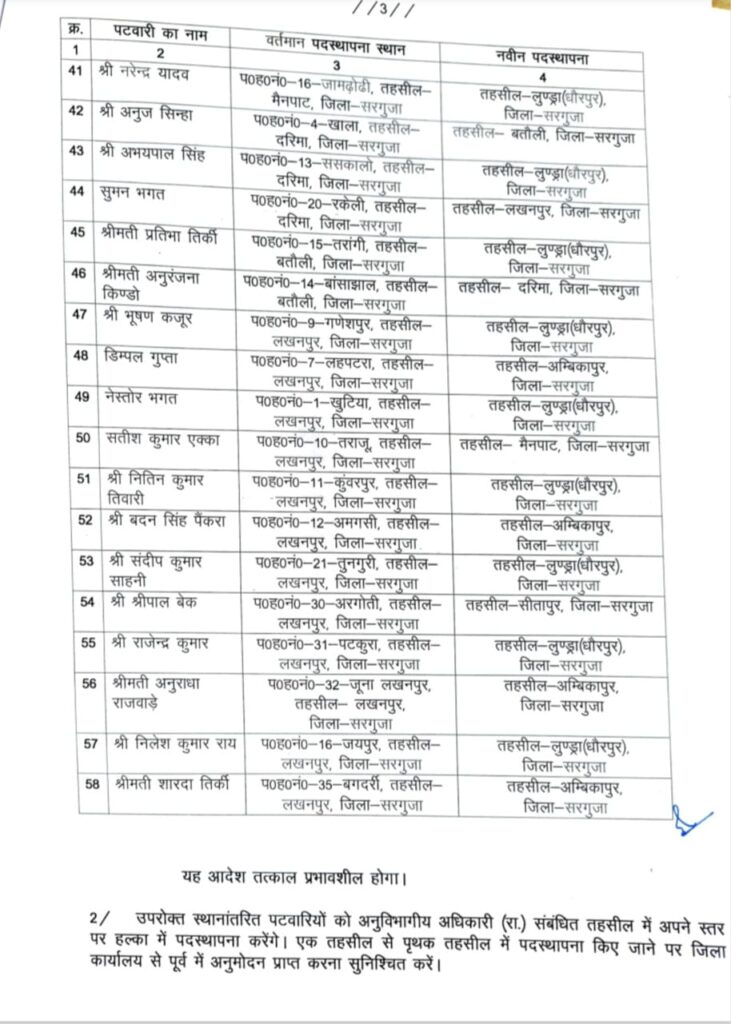 ( अम्बिकापुर, ) जिले के विभिन्न तहसीलों में लंबे समय से पदस्थ हल्का पटवारियों के कार्यों में प्रभावशीलता, प्रशासनिक दक्षता एवं लोकहित को दृष्टिगत रखते हुए 58 पटवारियों का स्थानांतरण आदेश जारी किया गया है।