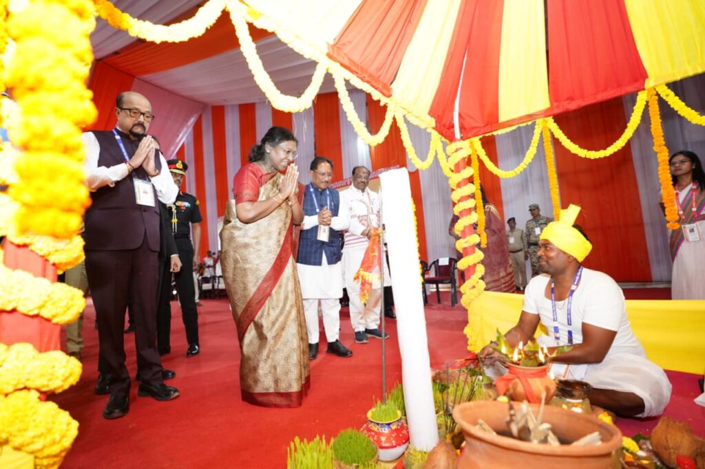 अंबिकापुर: राष्ट्रपति श्रीमती द्रौपदी मुर्मु जनजातीय गौरव दिवस के समापन समारोह में मुख्य अतिथि के रूप में शामिल हुईं। कार्यक्रम में राज्यपाल रमेन डेका, मुख्यमंत्री विष्णुदेव साय, राज्यमंत्री जनजातीय कार्य मंत्रालय भारत सरकार दुर्गा दास उईके, राज्यमंत्री आवास एवं शहरी मंत्रालय भारत सरकार श्री तोखन साहू, आदिम जाति विकास विभाग कृषि विकास एवं किसान कल्याण विभाग मंत्री रामविचार नेताम, प्रभारी मंत्री जिला सरगुजा एवं वित्त वाणिज्यिक कर विभाग मंत्री श्री ओमप्रकाश चौधरी, पर्यटन संस्कृति एवं धर्मस्व विभाग मंत्री श्री राजेश अग्रवाल, वन एवं जलवायु परिवर्तन परिवहन सहकारिता एवं संसदीय कार्य मंत्री केदार कश्यप, लोक स्वास्थ्य और परिवार कल्याण चिकित्सा शिक्षा पिछड़ा वर्ग एवं अल्पसंख्यक विकास 20 सूत्रीय कार्यक्रम क्रियान्वयन मंत्री श्याम बिहारी जायसवाल, महिला एवं बाल विकास समाज कल्याण विभाग मंत्री श्रीमती लक्ष्मी राजवाड़े, सरगुजा सांसद चिंतामणी महाराज, उत्तर रायपुर विधायक पुरंदर मिश्रा, जगदलपुर विधायक किरण सिंह देव, महापौर अम्बिकापुर श्रीमती मंजुषा भगत भी उपस्थित रहे।