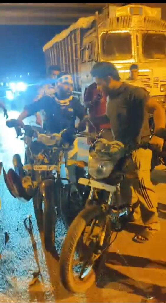 ओव्हर ब्रिज के नीचे ट्रकों के खड़े होने के कारण कल रात फिर दो मोटरसाइकिल आपस में टकराए जाने से दोनों वाहने बुरी तरह क्षतिग्रस्त हुई तो वहीं एक के पार फ्रैक्चर होने की जानकारी बताई गई ।