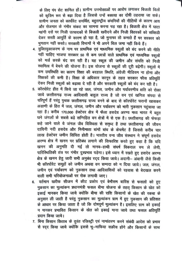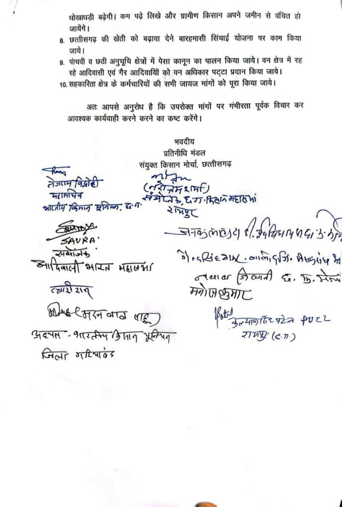 ज्ञापन संयुक्त किसान मोर्चा, छत्तीसगढ़ के प्रतिनिधिमंडल द्वारा सौंपा गया, जिसमें अखिल भारतीय क्रांतिकारी किसान सभा, छत्तीसगढ़ किसान मजदूर महासंघ, आदिवासी भारत महासंघ और भारतीय किसान यूनियन सहित कई संगठनों के पदाधिकारी शामिल रहे।