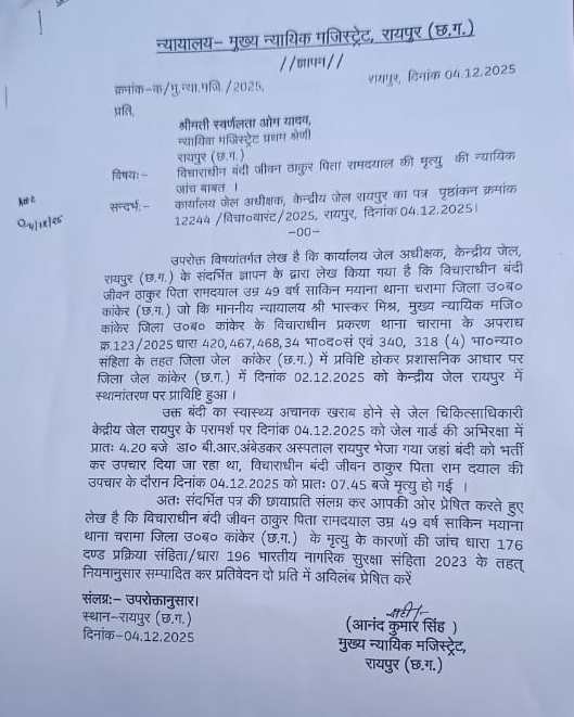 इधर बढ़ते विरोध और गंभीर आरोपों के बाद मुख्य न्यायिक मजिस्ट्रेट, रायपुर ने इस पूरे मामले में न्यायिक जांच के आदेश जारी किए हैं, वहीं जेल महानिरीक्षक (IG जेल) ने कांकेर जिला जेल के जेलर को हटा दिया है।