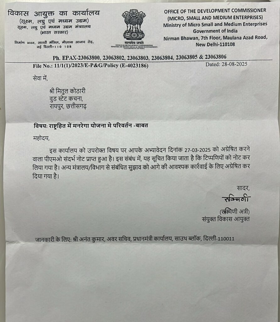 रायपुर। केंद्र सरकार ने ग्रामीण रोजगार की दिशा में बदलाव के लिए बड़ा कदम उठाया है। सरकार ने ग्रामीण रोजगार में बड़ा बदलाव करते हुए मनरेगा योजना की जगह विकसित भारत-रोजगार और आजीविका गारंटी मिशन यानी विकसित भारत जी राम जी योजना ला रही है। केंद्र सरकार की इस सोच के पीछे छत्तीसगढ़ का बड़ा योगदान है। मनरेगा योजना में बदलाव के लिए भाजपा के सोशल मीडिया सह संयोजक मितुल कोठारी ने प्रधानमंत्री कार्यालय को पत्र लिखा था।