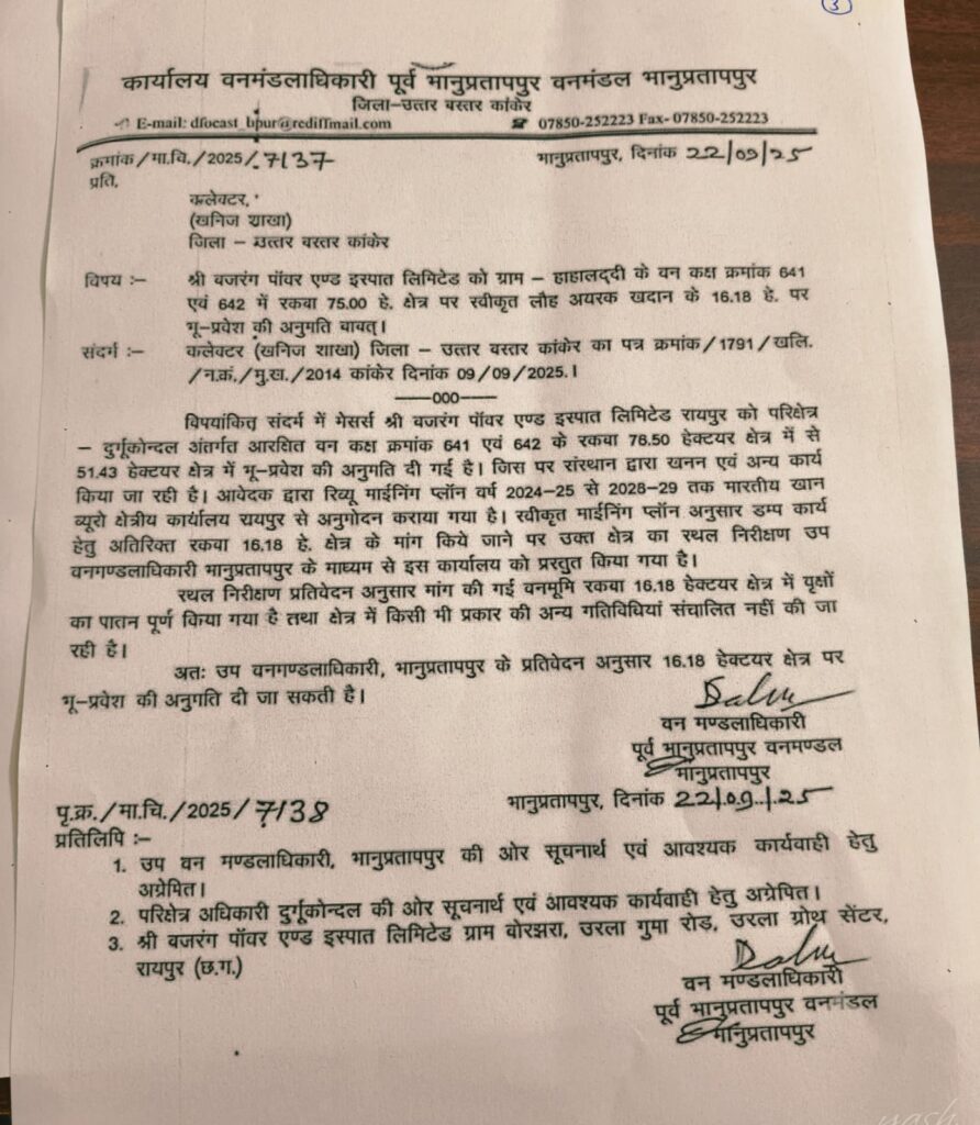 यह मामला तब उजागर हुआ जब उप वनमंडलाधिकारी, पूर्व भानुप्रतापपुर ने कलेक्टर खनिज शाखा को पत्र क्र. 7137, दिनांक 22/09/2025 के माध्यम से नियम के विपरीत भू-प्रवेश की अनुमति के लिए झूठी अनुशंसा की।