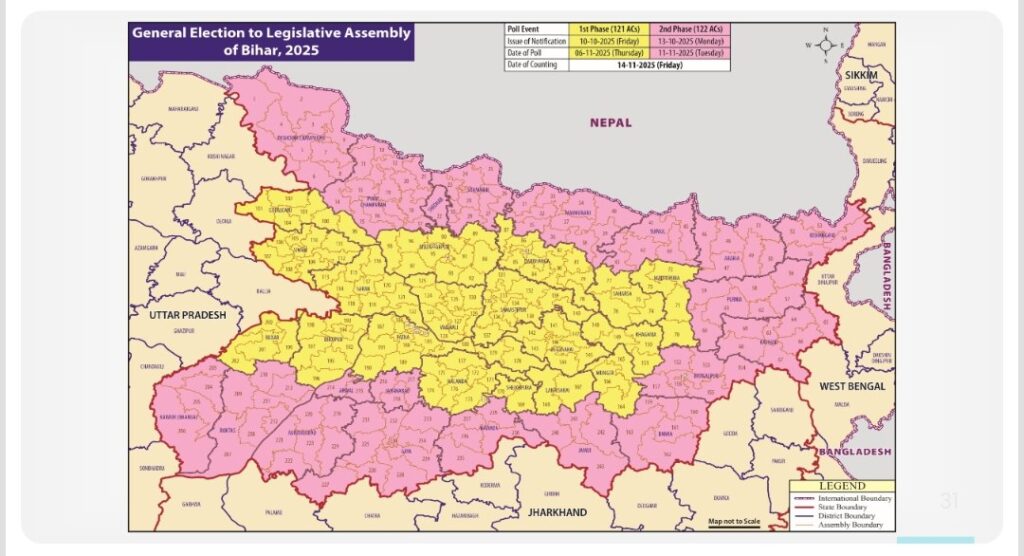 निर्वाचन आयोग ने इस बार चुनाव को दो चरणों में कराने का निर्णय लिया है। सूत्रों के अनुसार, प्रवासी बिहारियों की छठ पर्व के बाद वापसी को ध्यान में रखकर यह कार्यक्रम तय किया गया है। पहले चरण में उत्तरी और मध्य जिलों को शामिल किया गया है ताकि मतदाताओं की अधिकतम भागीदारी सुनिश्चित हो सके।