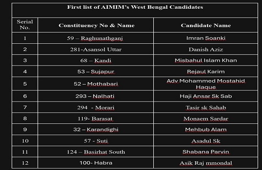 प्रमुख उम्मीदवारों के नाम जारी सूची के अनुसार, एआईएमआईएम ने मोथाबाड़ी से एडवोकेट मोहम्मद मुस्तहिद हक, सुजापुर से रेजाउल करीम और कांडी से मिस्बाहुल इस्लाम खान को प्रत्याशी बनाया है। वहीं रघुनाथगंज से इमरान सोलंकी, आसनसोल से दानिश अजीज, मुरारई से तासीर शेख और नलहाटी से हाजी अंसार शेख चुनाव लड़ेंगे। इसके अतिरिक्त बशीरहाट से शबाना परवीन और हावड़ा से असिक राज मंडल पर पार्टी ने भरोसा जताया है।