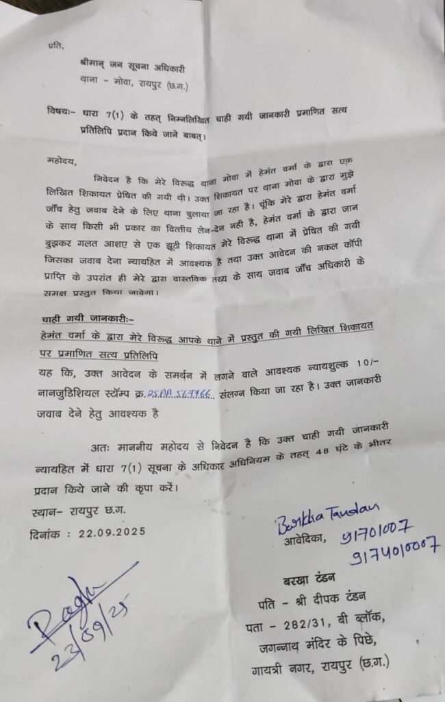 वहीं, दंपत्ति का कहना है कि रिश्ते के दौरान उन्होंने दो करोड़ रुपए से ज्यादा की रकम डीएसपी को दी। यह रकम अलग-अलग समय पर और अलग-अलग तरीकों से दी गई। बरखा टंडन का आरोप है कि उन्होंने दबाव में आकर 45 लाख रुपये का एक चेक भी छत्तीसगढ़ पुलिस की डीएसपी को दिया था, जिसे बाद में डीएसपी के पक्ष में भुना लिया गया।